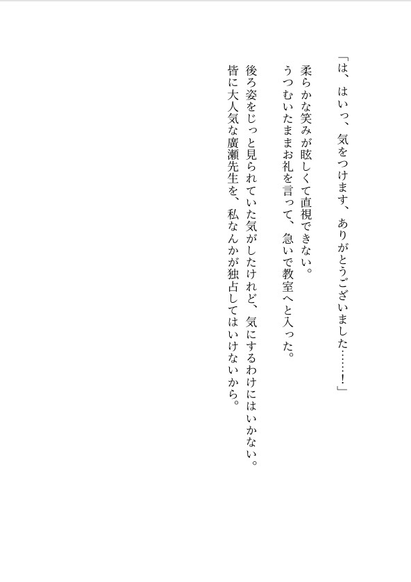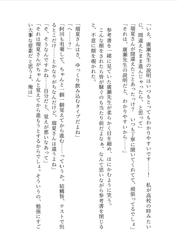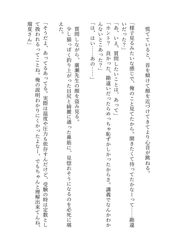 ある日、講義で質問をしたいところがあった瑠夏だったが廣瀬先生は若くてイケメンでいつも女子に囲まれているため、なかなか質問ができずにいた。諦めて次の講義の準備をしていると「瑠夏さん。俺になんか聞こうとしてた?」と声をかけてくれた。おかげで内容の理解ができたものの「覚えが悪い」という瑠夏に、廣瀬先生は