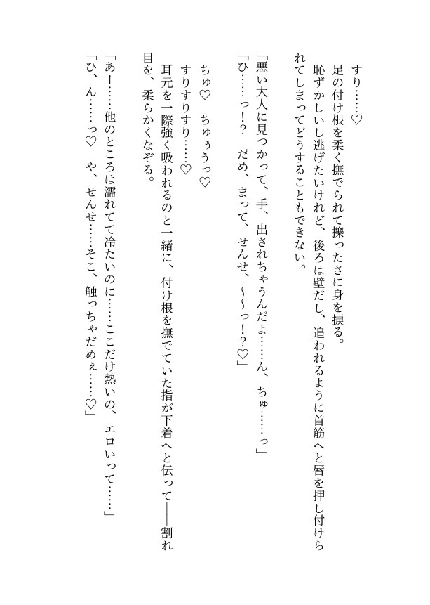 「ほんとだ、パンツも可愛い……けどやっぱ、危ないね。スカートなのに、こんな布ちっちゃいパンツ履いてたら、さ。ほら、こうやって……悪い大人に見つかって、手、出されちゃうんだよ」