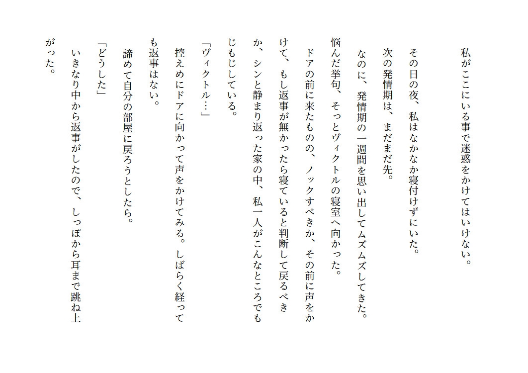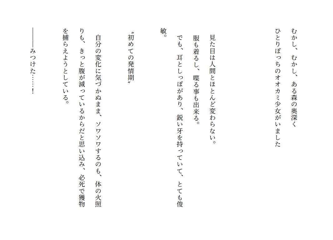 私(独りぼっちのオオカミ/見た目年齢20歳ぐらい)・群れからはぐれた、少し抜けてる落ちこぼれオオカミ少女・充分なエサが獲れず常にお腹ぺこぺこ・初めての発情期が来たが、交尾の仕方は知らない