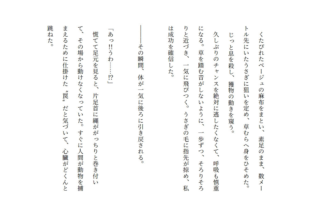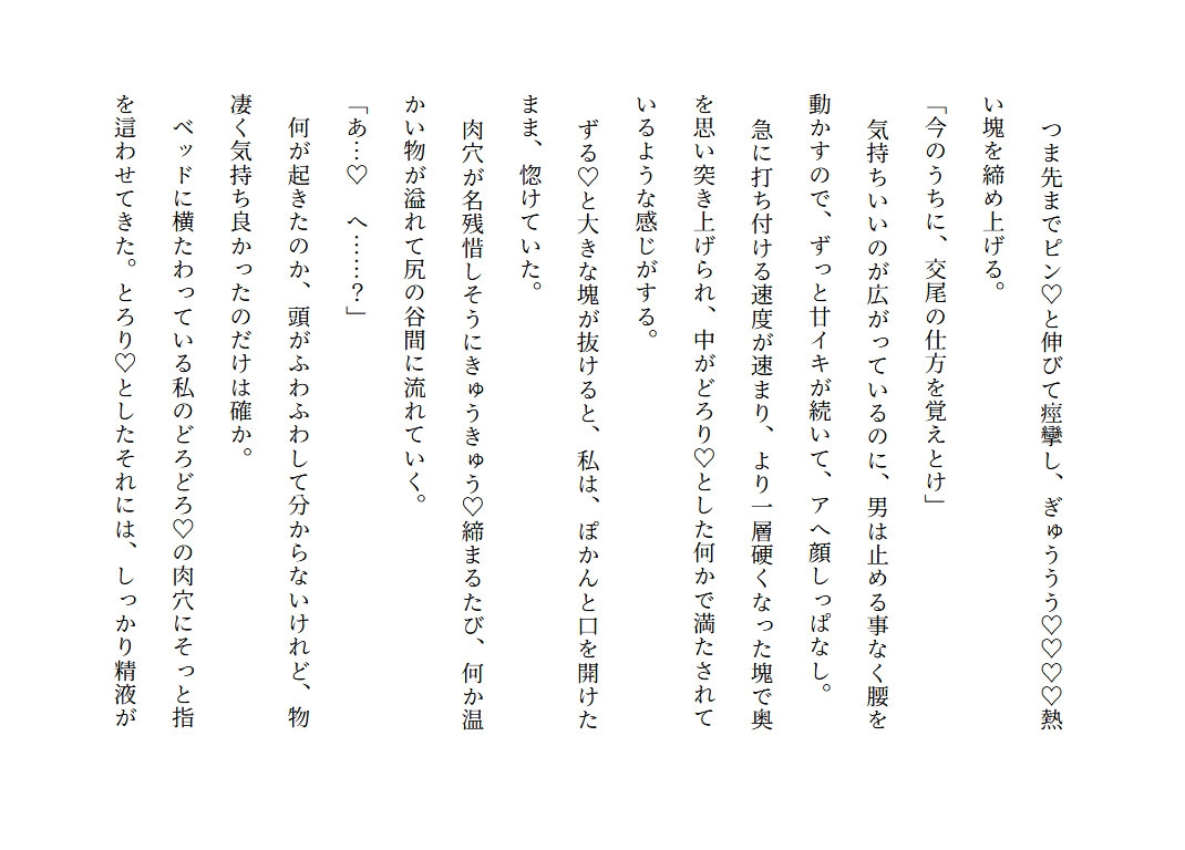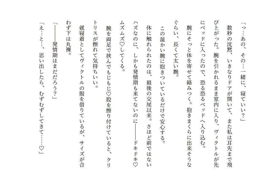 一人ぼっちでエサを狩るのに必死だったオオカミの私が、運悪く人間の仕掛けた小動物用の罠にかかってしまった!初めての発情期に戸惑う私だったけど、限界知らずなドロあま交尾にすっかりハマってしまい、共同生活が始まる。奴○のように扱われる事は無いけど、ヴィクトルの真意が分からないままの生活。ある日、留守番をしていると獣人狩りの密猟者に見つかってしまい―――…