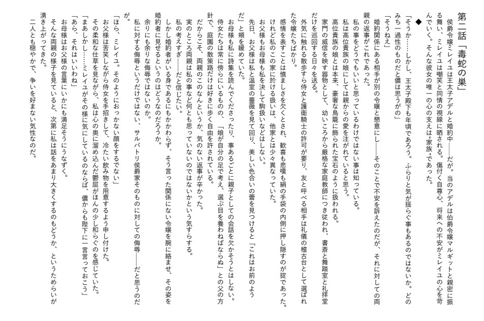 幼い頃に出会った少女への初恋を胸に秘めた公爵家嫡男と、輝きを失った婚約者の再生を描く王道ロマンス「悪女仕草」。婚約者に蔑ろにされながらも、家族という心の支えにすがる侯爵令嬢の苦悩「毒蛇の巣」。極端なフェミニズム国家に疲弊したスパダリ王太子の奮闘記「フェミ★婚」。政略結婚で結ばれた完璧な二人が、禁断の恋に揺れ動く「最も遠い、隣のあなたへ」。没落危機に心を閉ざしたツンデレ令嬢と、その棘の奥を見抜こうとする富豪子息の不器用な恋「雪溶けるツンデ令嬢春きたる」──。