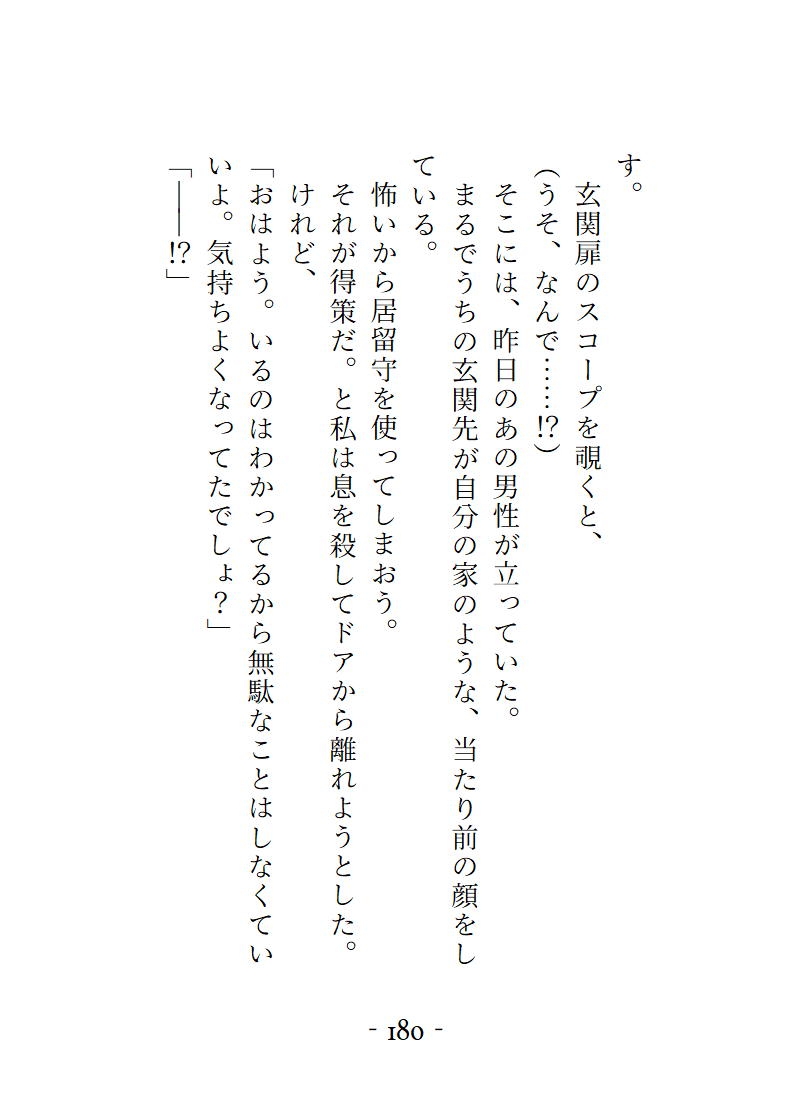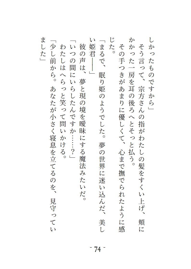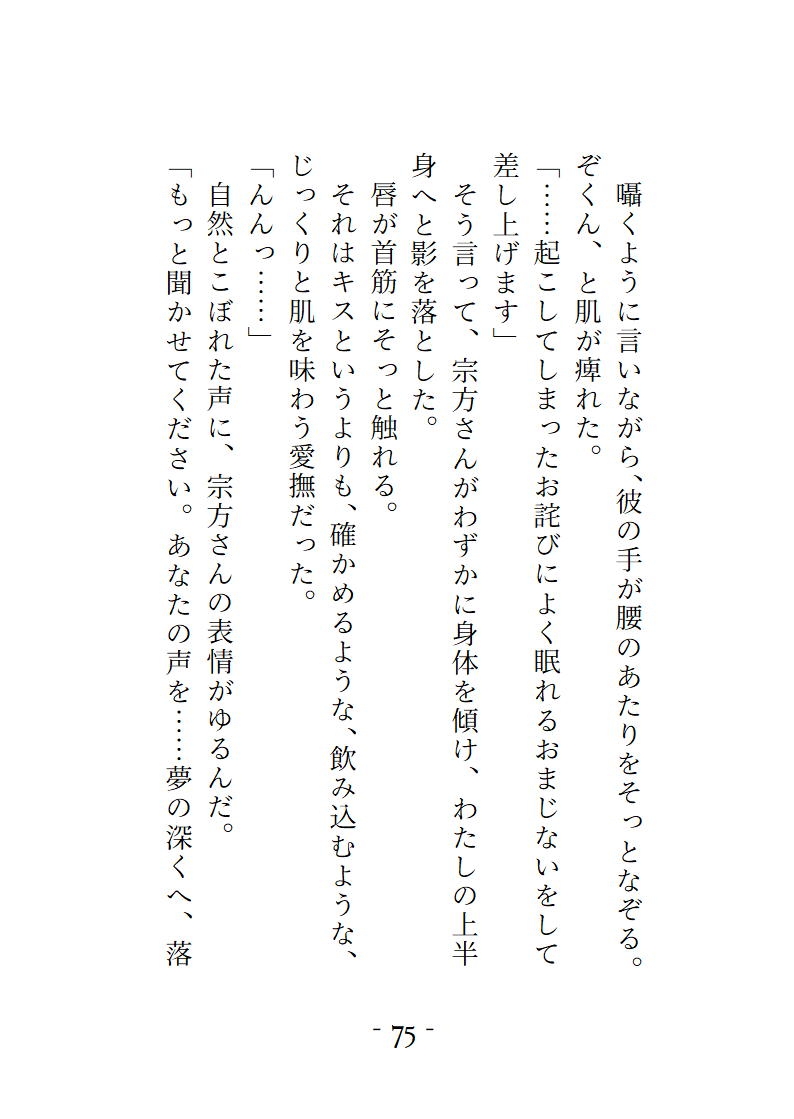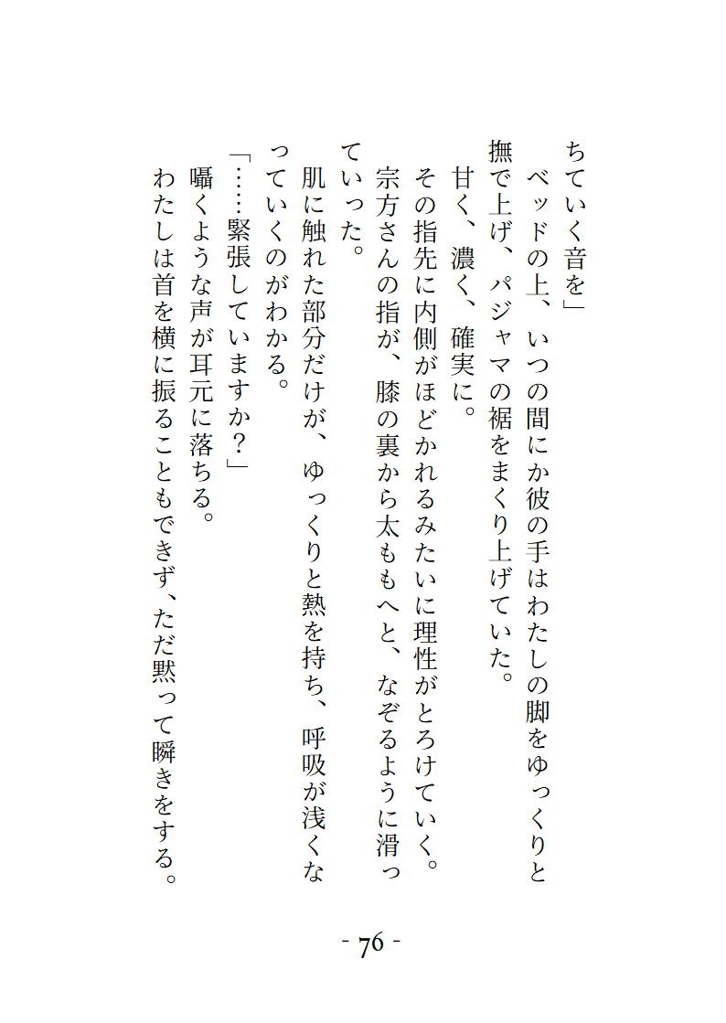 夜中、ふと目覚めると宗方がすぐそばにいた。本当なら異常な出来事だというのに、「わたし」は疑問も持たずに宗方の愛撫をうけることに――。