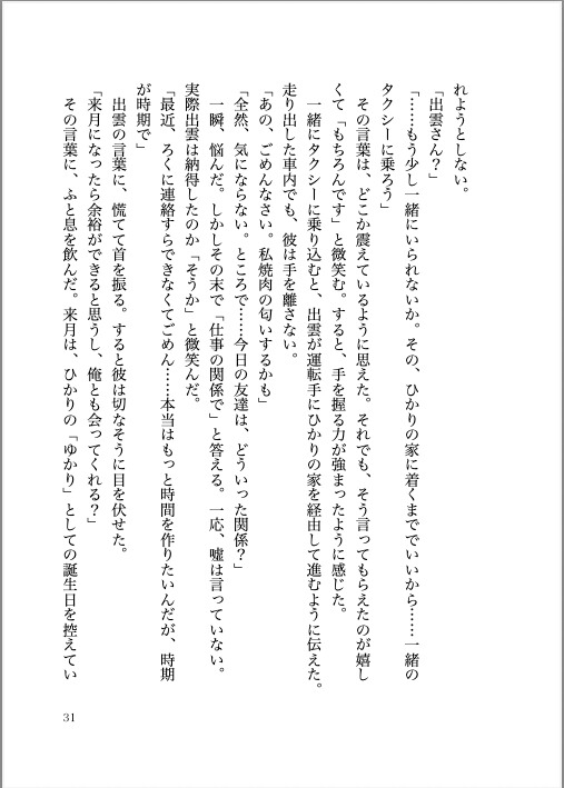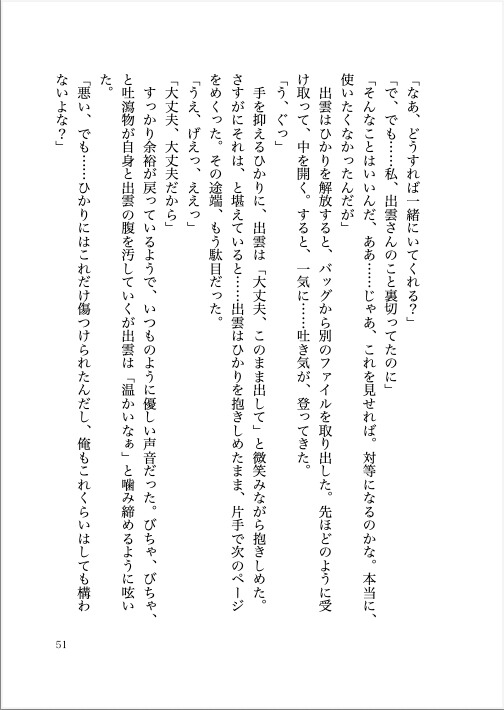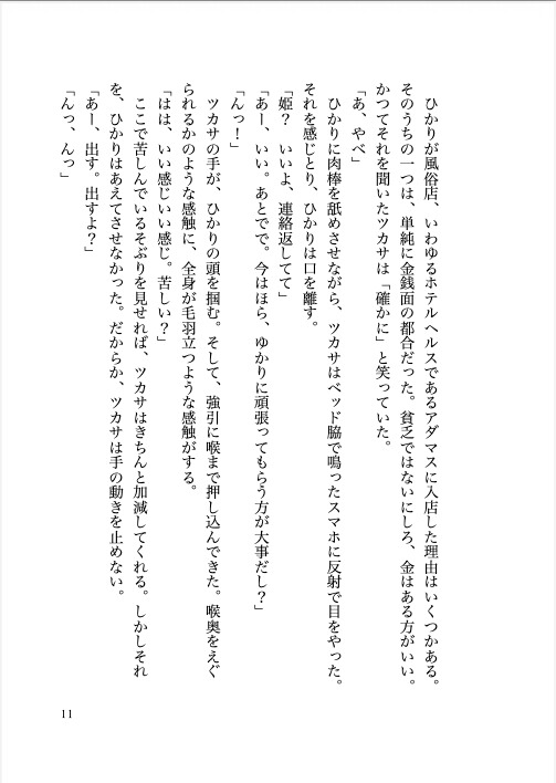 【登場人物】・雪城 ひかり宝石鑑定士として働く女性。依頼をしてきた出雲と恋仲になる。しかし出雲が全然抱いてくれず、資金調達と腹いせを兼ねて「ゆかり」という源氏名で風俗嬢を始める。繊細で優柔不断だが、人の気持ちを思いやる心が強い。流されやすく、激しく動揺すると嘔吐する体質。