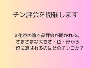 文化祭の陰で品評会が開かれる。さまざまな大きさ・色・形から一位に選ばれるのはどのチンコか?本文:7000字程度挿絵:なし