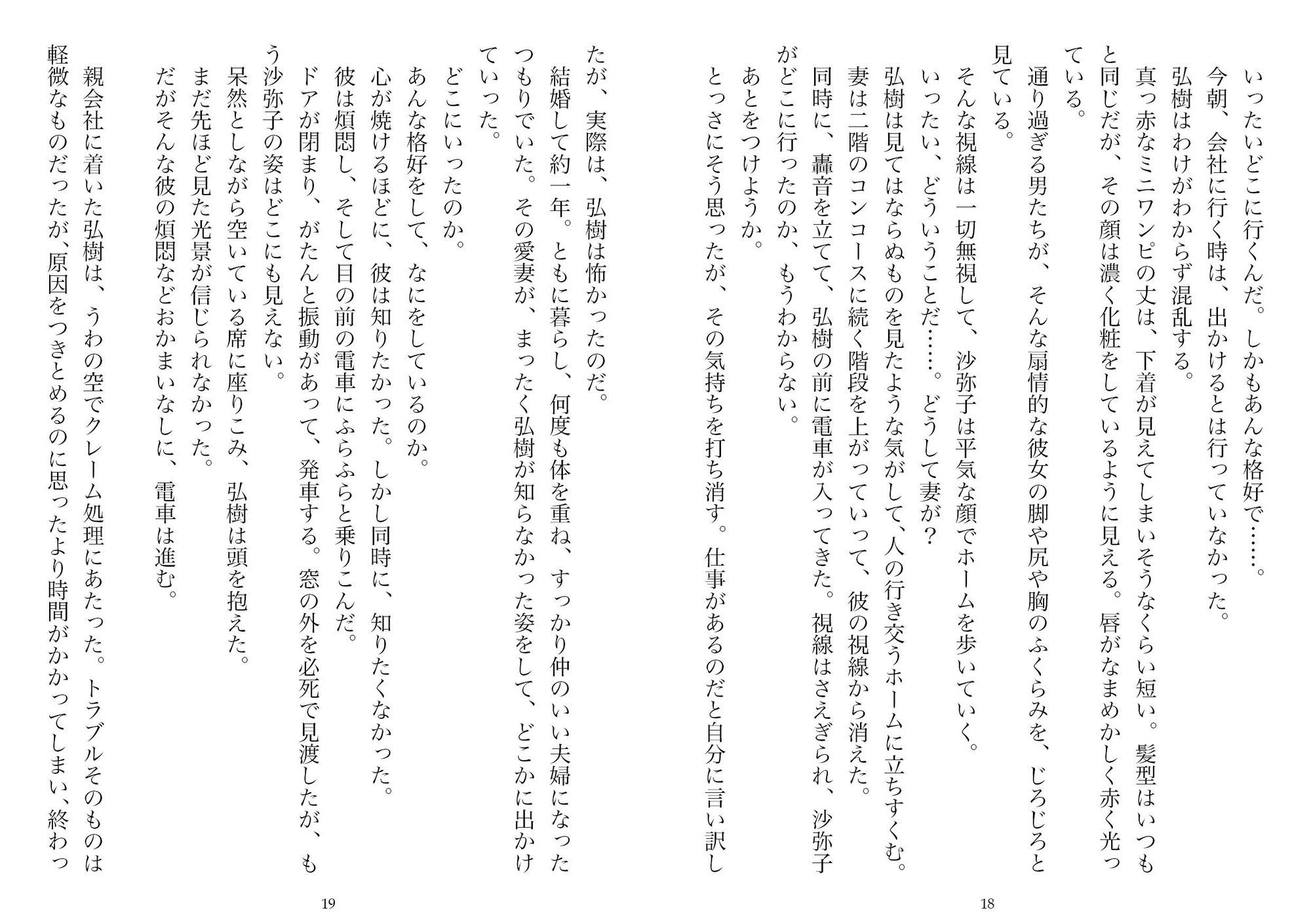 あらすじ:弘樹はシステム会社のプログラマ、三十歳だ。沙弥子と一年前に結婚した。仕事は忙しいが、幸せだと思っていた日々。それは、駅で今まで見たことのないような色っぽい服装で、どこかへ出かける妻を目撃してしまうことで、崩れていく。彼は悩んだ末、ストーカーアプリを彼女のスマートフォンにインストールする。そして清楚だと思っていた妻の淫らな正体を、弘樹は知ってしまう。その妻の姿は、衝撃的なものだった…。