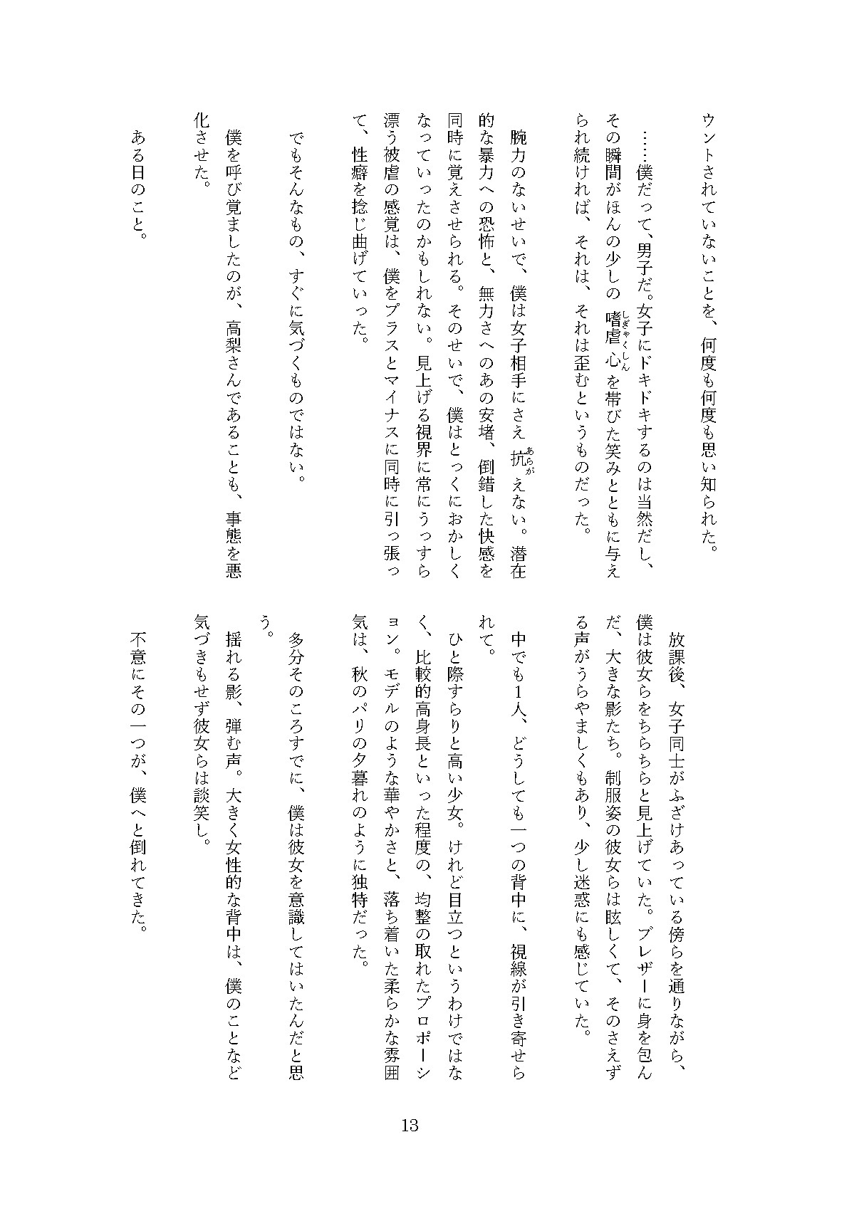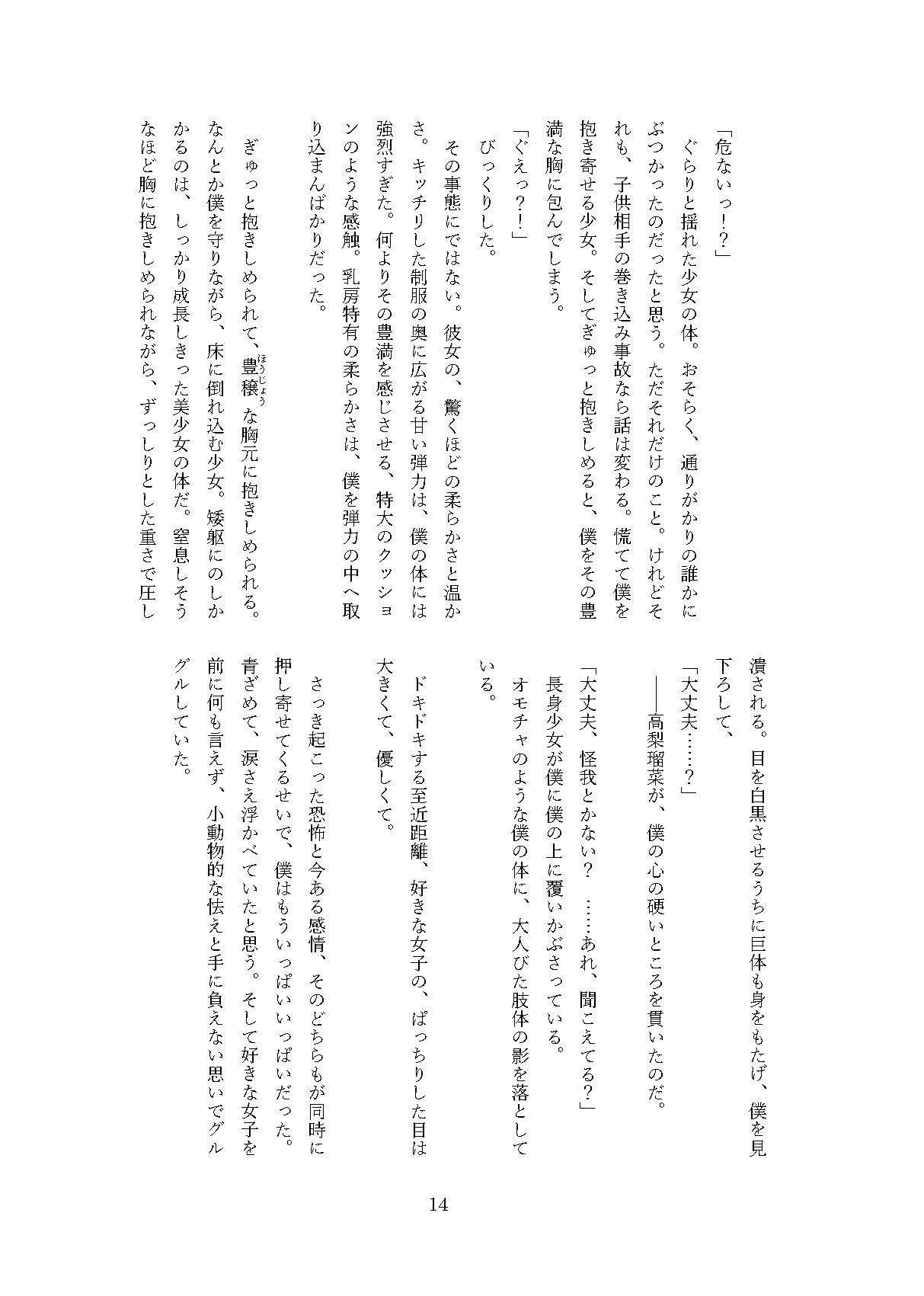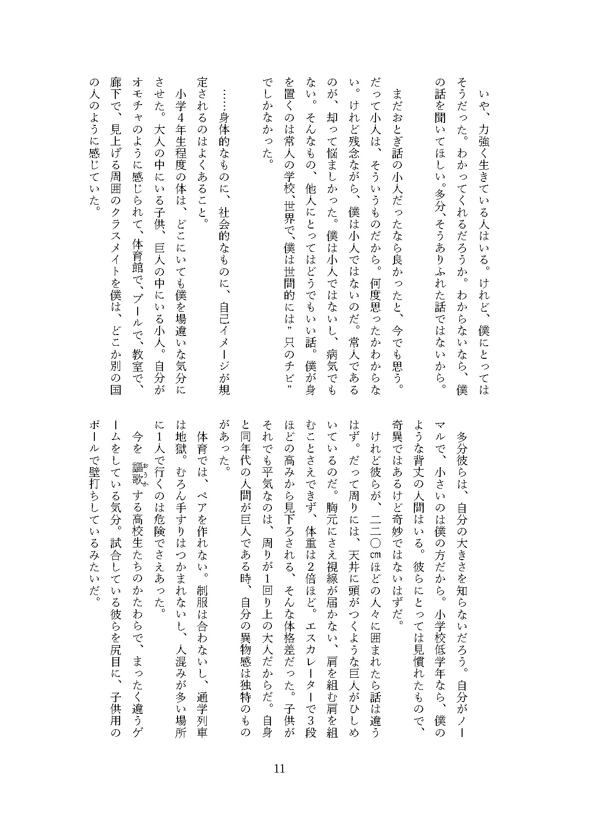 2年半かけて投稿していたシリーズの完結版です。表題作を前編にし、非サイズフェチ作品の同シリーズを後編として付け加えたものです。二人の、よく似た二つの物語が並行して進む本作。全体的に意味合いもかなり変わっていますので、お楽しみいただければ幸いです。