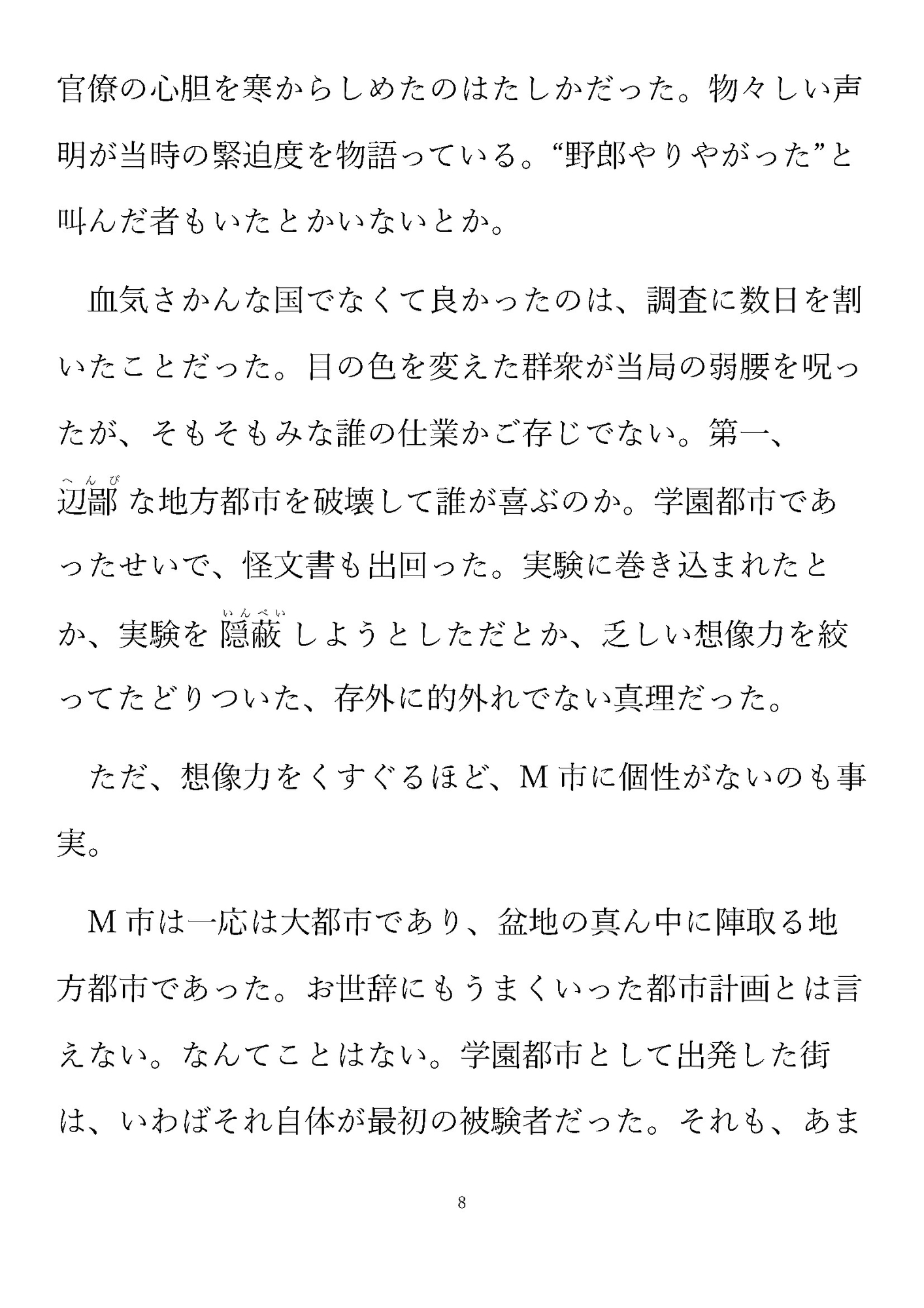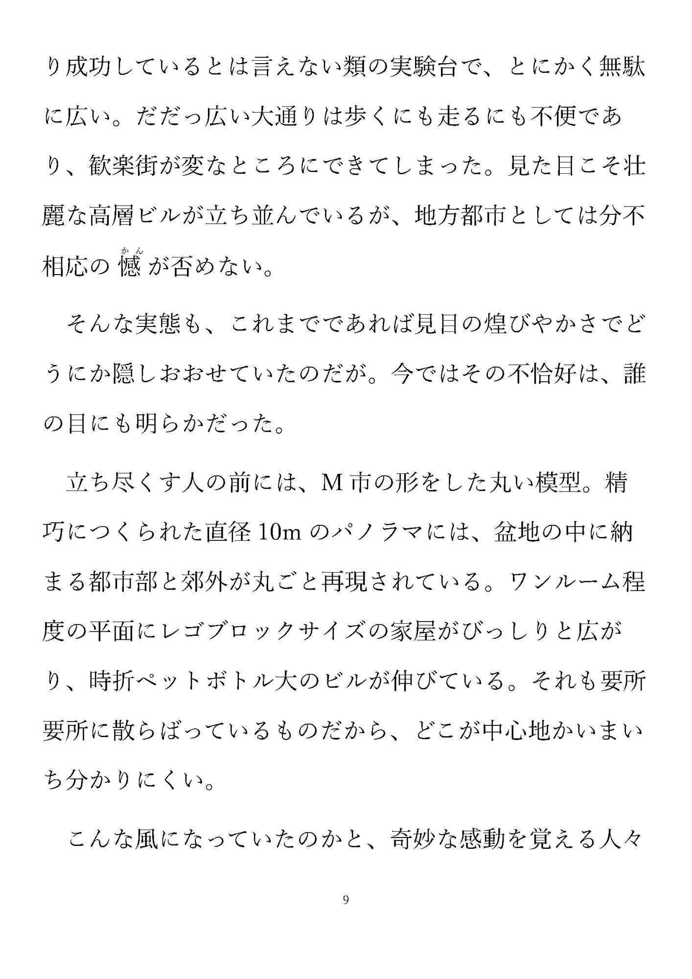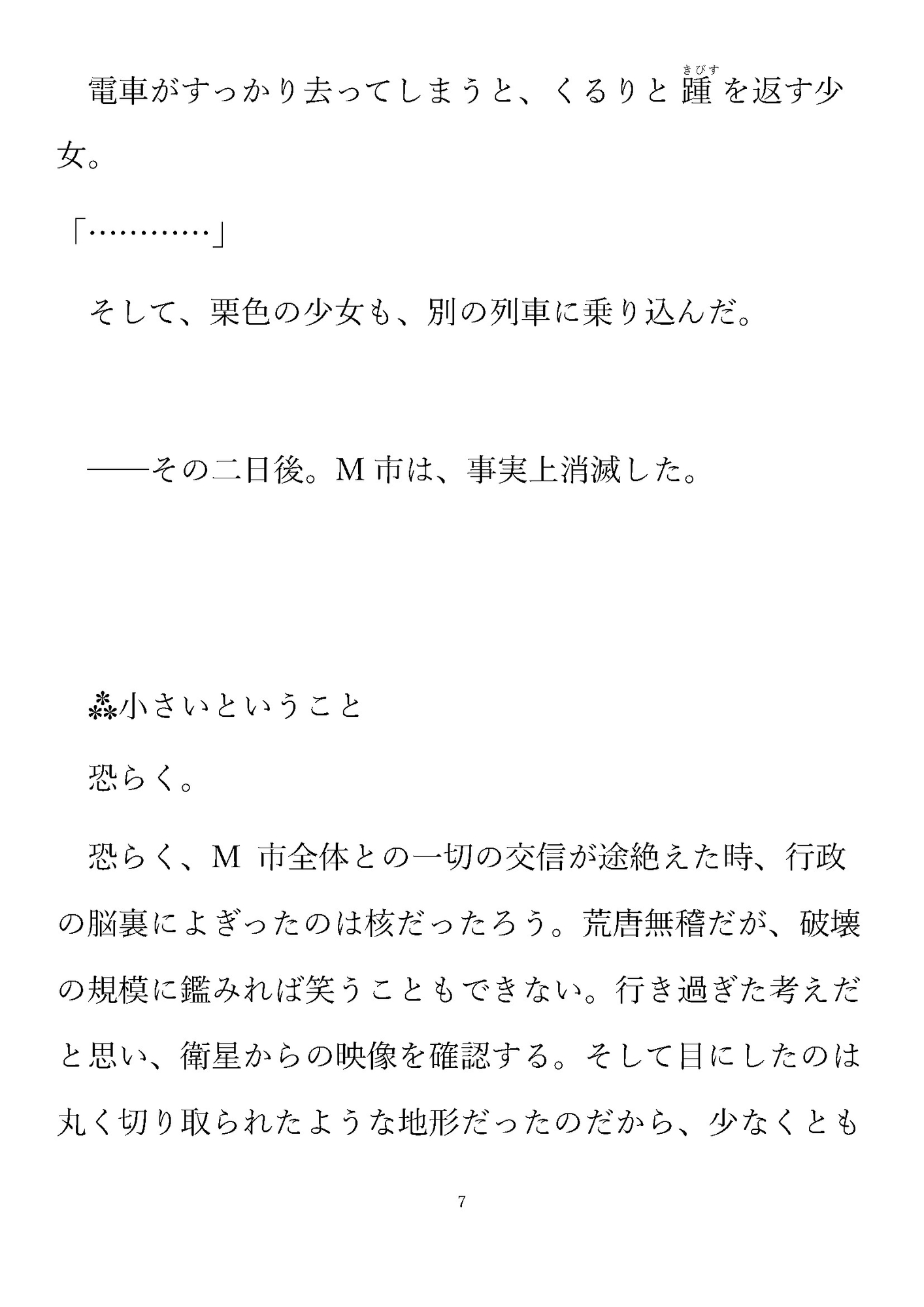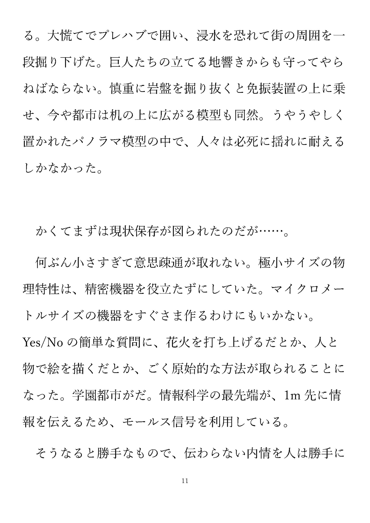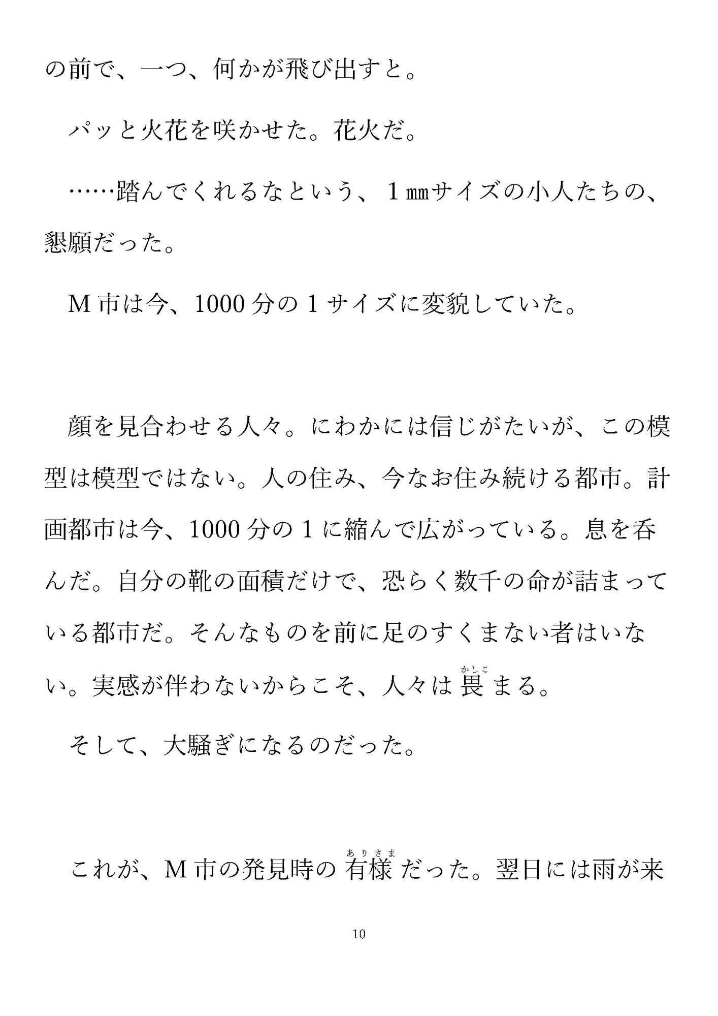 縮小都市の混乱、少女との蜜月、倒錯、急転のお話です。守護女神のような少女にエッチに使い潰されたい方は是非