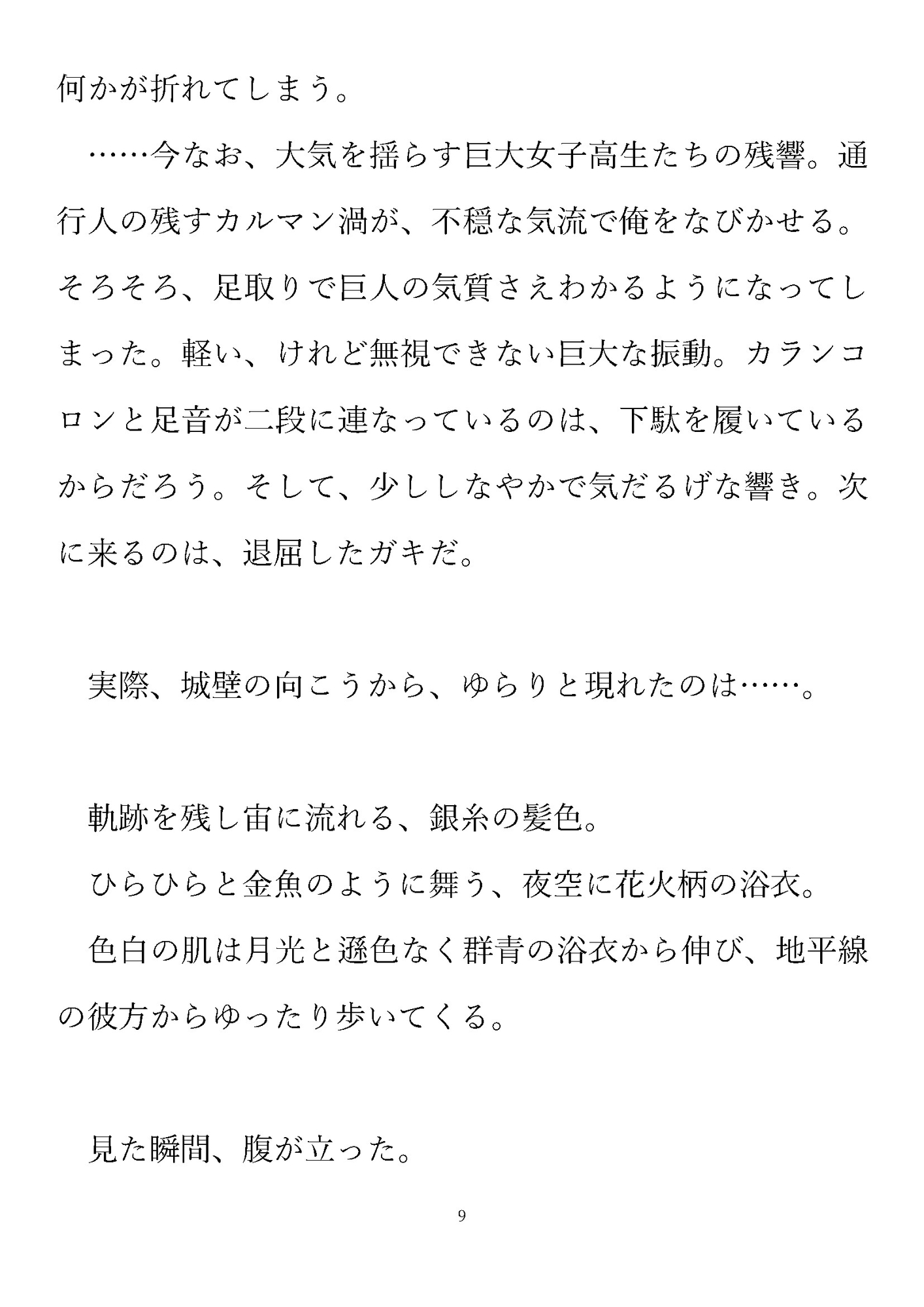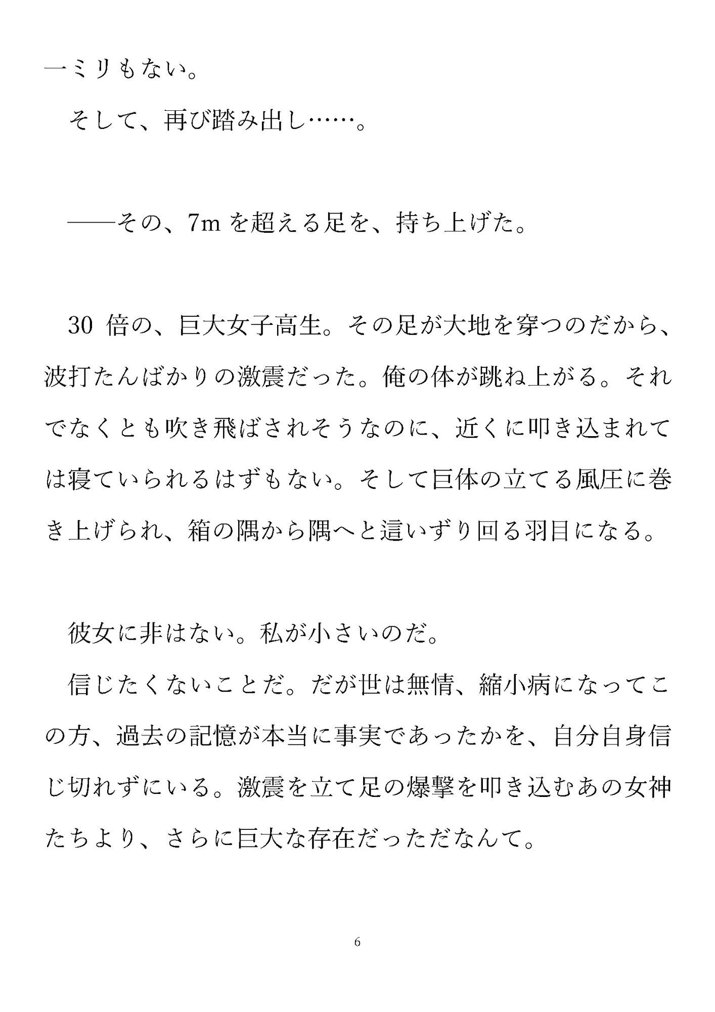 【内容】・(30倍)しゃがみパンチラ煽り、足袋おみ足プレス・(30倍)自分の入った袋に座られて破裂、巨尻プレス、太ももの間に閉じ込められて再縮小・(300倍)パンツ登り教養、ぶら下がった状態で歩き回られた後、食い込みショーツ監禁・(300倍)りんご飴に張り付けられてゆっくり舐め取られ、口内凌○・(300倍)踵を上げた足裏と下駄の間で足裏見抜き強○、その後履き潰し・(300倍)聖水責め以上です(20000字)