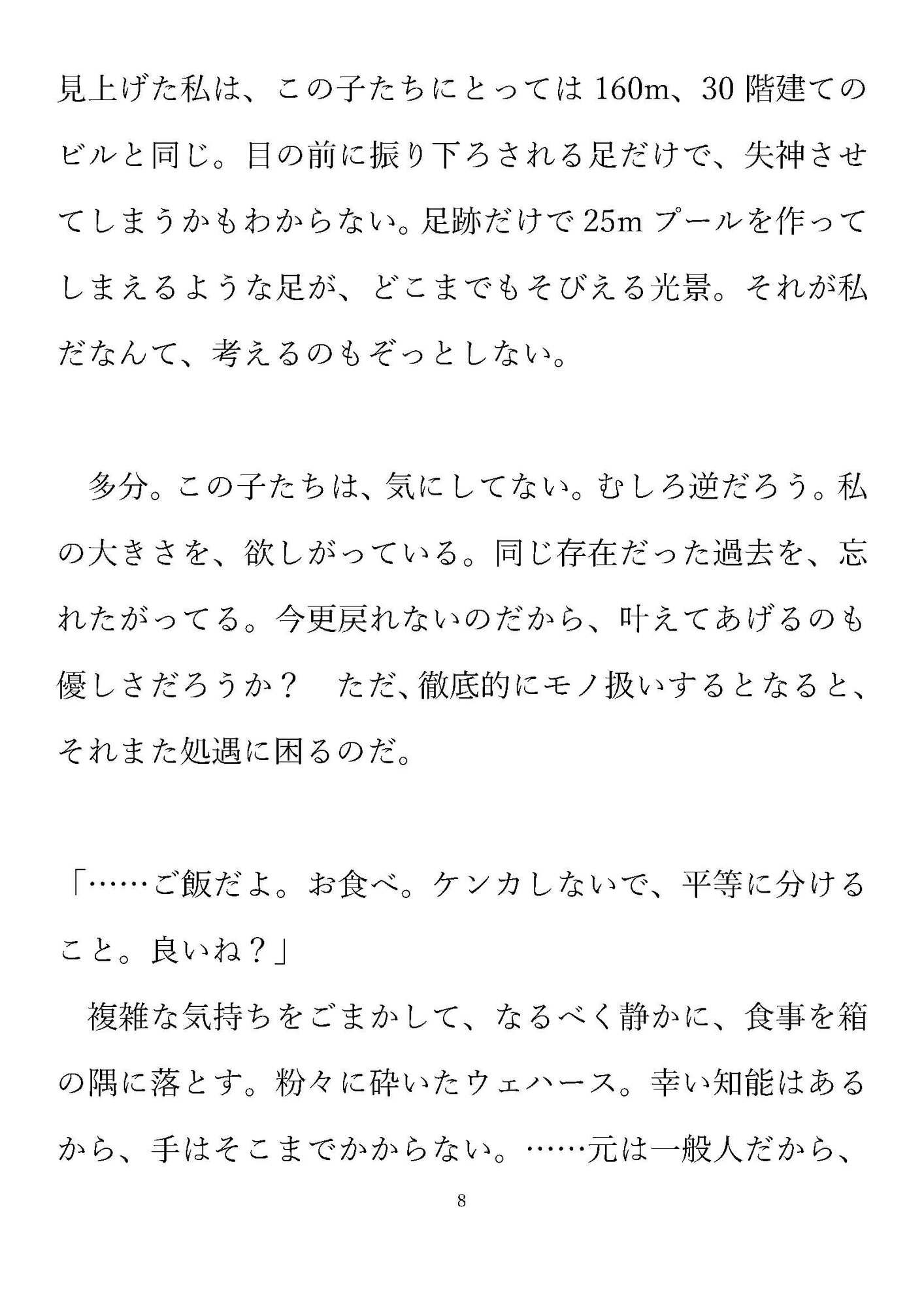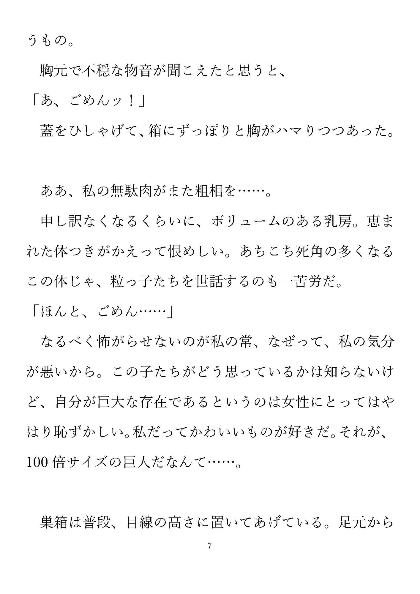 【内容】※基本100倍差(前戯)・無意識太ももプレス、ペディキュアおみ足舐めさせ奉仕、口内監禁・脱衣、全身奉仕、乳揉み、ブラ内監禁(尻シチュ)・箱ごと小人粉砕、小人まみれの尻揉み見せつけ、アナル監禁、アナルビーズでの封鎖(胸シチュ)・1mmサイズへの縮小乳揉み、乳首に乗せて舐め取り、ローションおっぱい責め(ディルドシチュ)・小人まみれのディルドプレイ、四つん這いで巨乳を爆揺れさせながらの天変地異オナニー以上です。