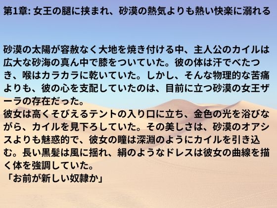 『砂漠の女王と奴○の戦士』は、官能的で支配的な愛が描かれた物語。砂漠という非日常的な舞台で、ザーラとカイルの深い絆が映え、読者を異世界への旅に誘う。キャッチコピーの「砂漠の夜、女王の蜜壺に堕ちる」が示すように、一度読み始めたら抜け出せない、魅惑的な世界が広がっている。イラストはAIで生成しています。作品はほぼ文字で構成されています。