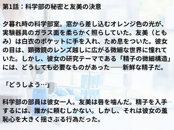 「科学部の秘め事~精子を追う少女の禁断研究~」は、研究と官能の狭間で揺れ動く少女の物語。彼女の好奇心が、危険な世界へと誘う。顕微鏡の下、友美の濡れた実験室で繰り広げられる禁断の研究を、ぜひご堪能ください。イラストはAIで生成しています。作品はほぼ文字で構成されています。