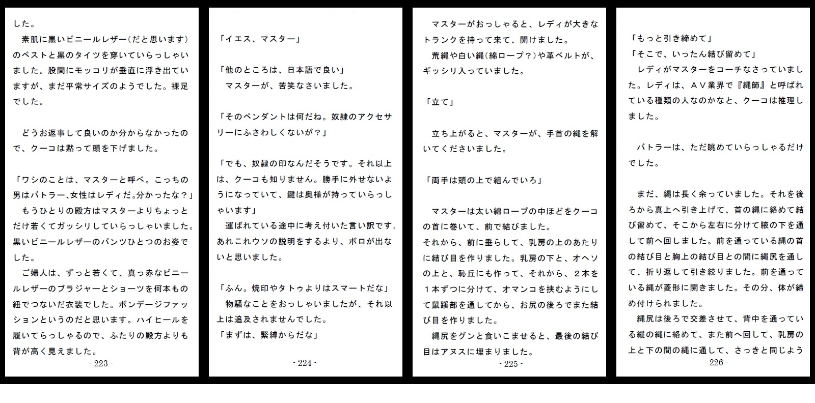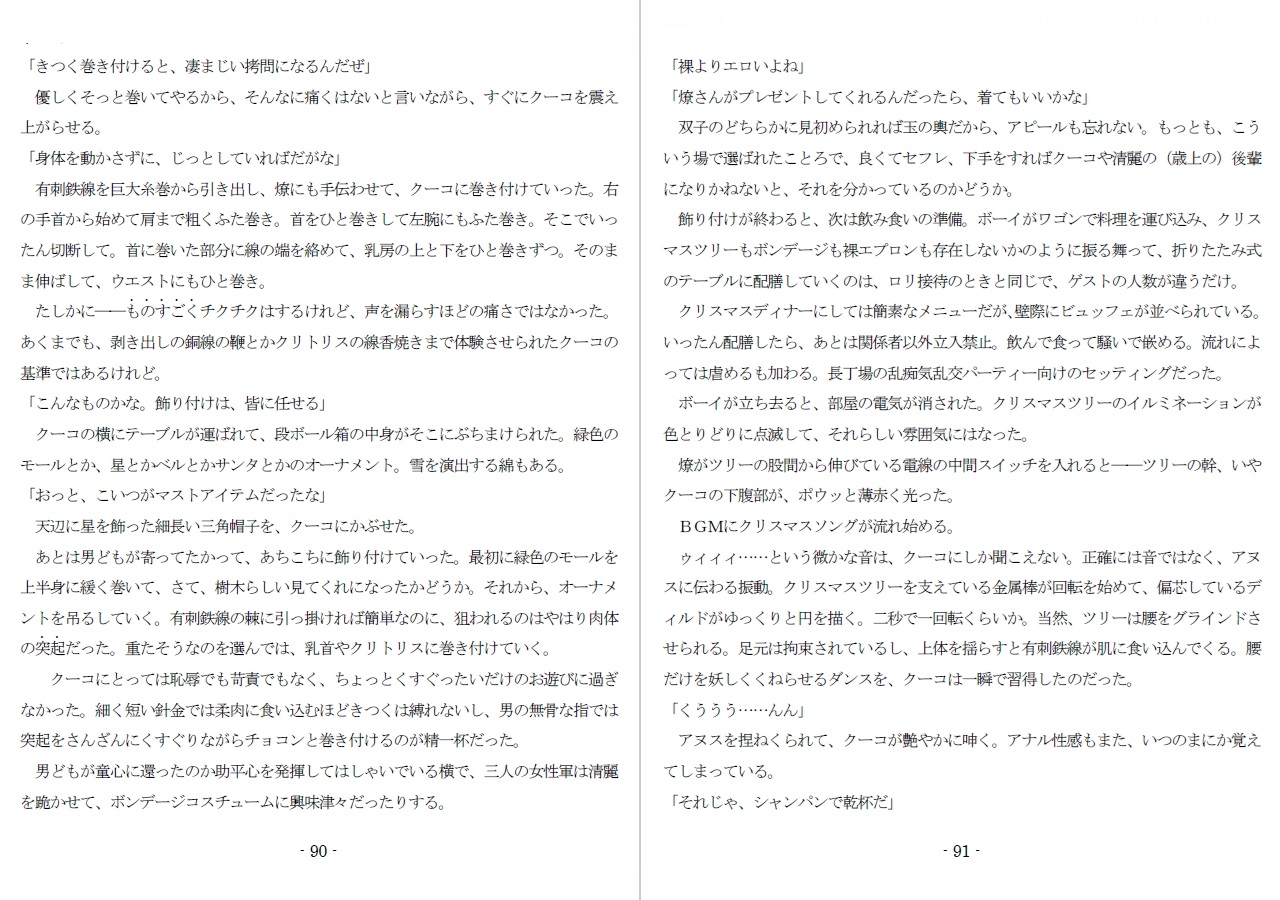 ※酷虐使役編では、高級ソープの他にチョンの間でもアルバイトをさせられ、二作目のAVで江戸時代の女囚もので本気の○問に掛けられ、さらには性接待で、初心者のくせに妄想に突っ走って無茶をするサディストに電撃責めで殺されかけ、半田鏝で淫紋を刻まれるまでが描かれます。半田鏝の淫紋は見苦しいので、周囲に(昼も見える)UVタトゥを施して体裁を整えます。