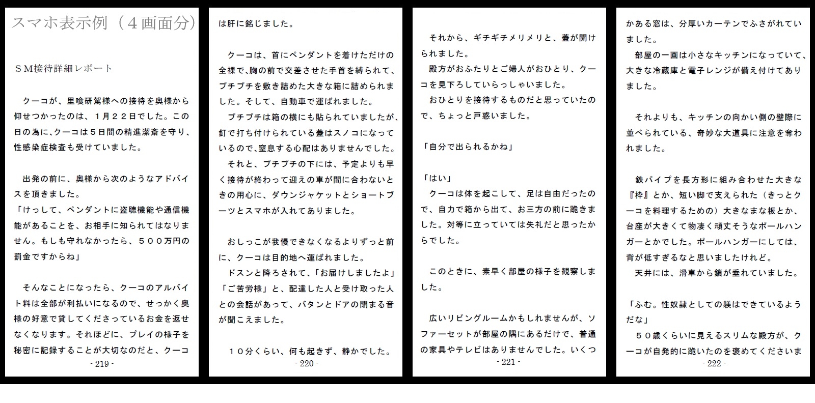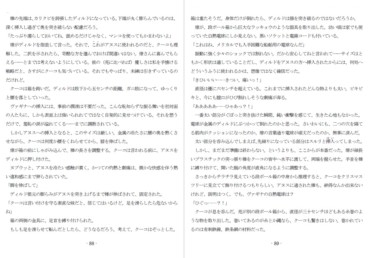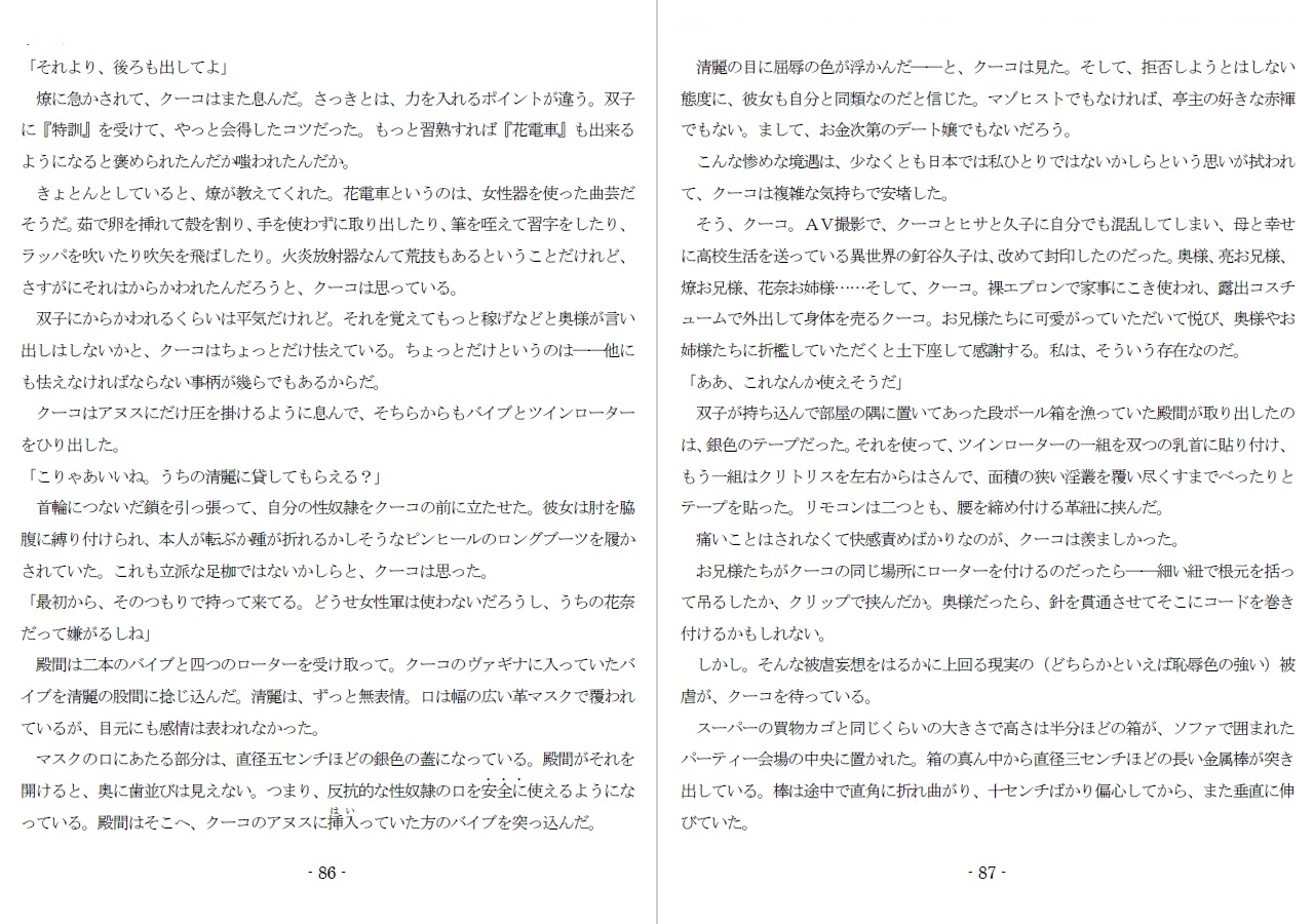 この作品は、未校訂の第一稿をノクターンノベルスに『800万円のDVDとして連載した後、各編脱稿後に副次的なエピソードを追加してあります。本書『酷虐使役編』では、テキストベースで下記の差異があります。ノクターン:11万5千文字製品版:12万1千文字