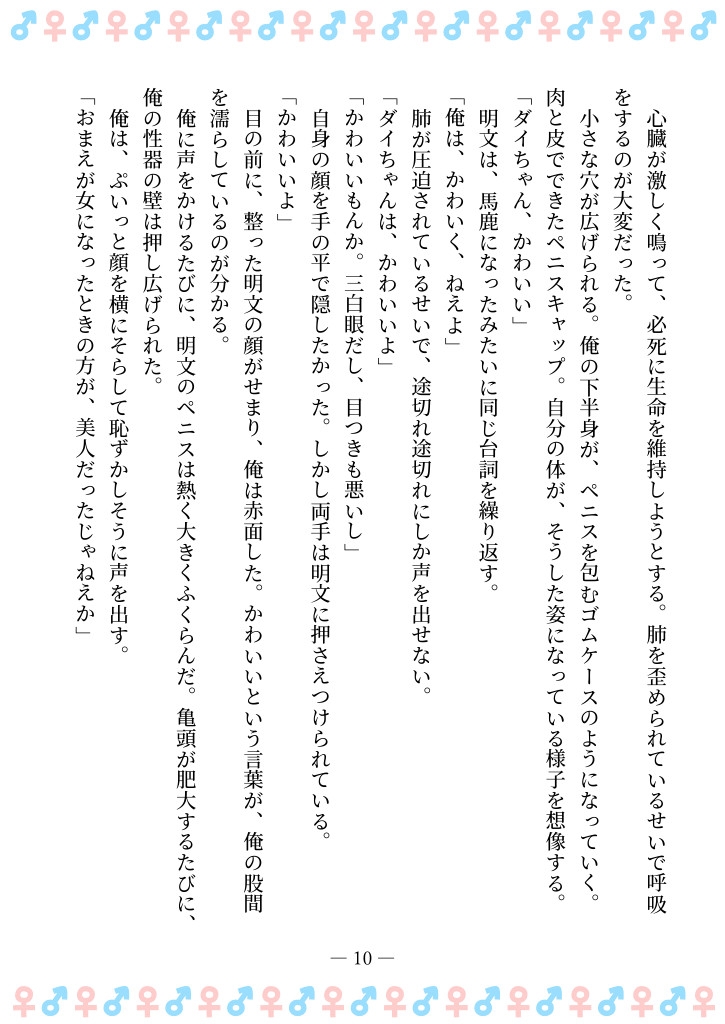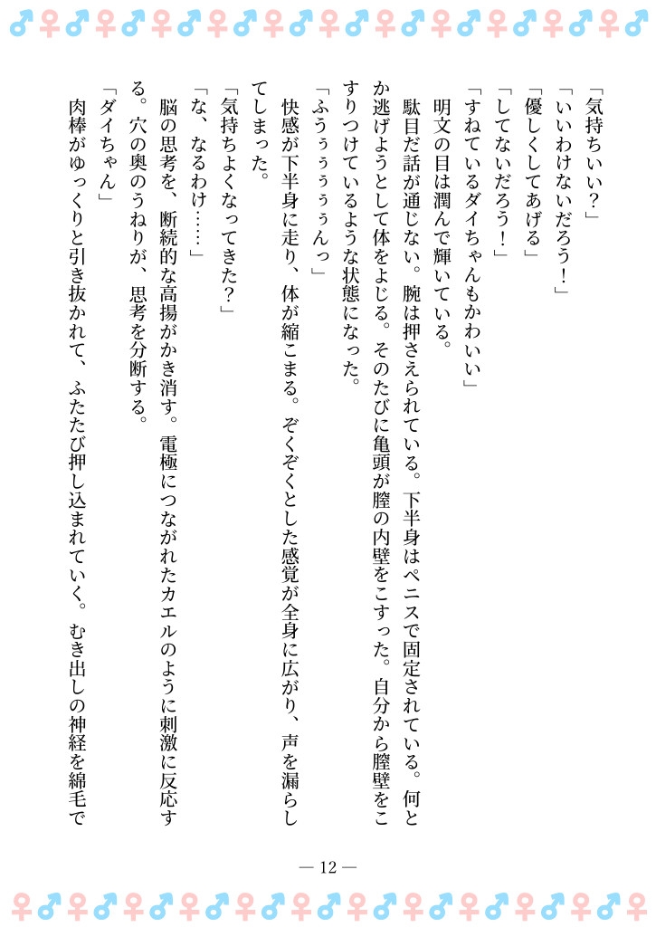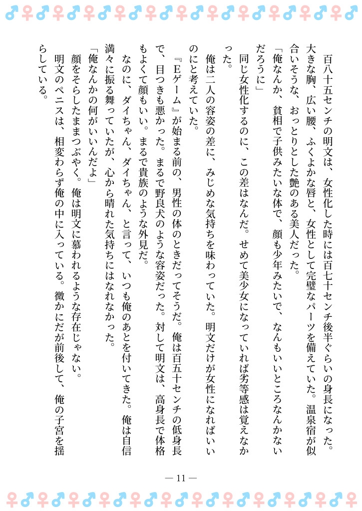 『Eゲーム』には「チャレンジリスト」が表示された。ハグやツーショット、キスや首なめなど、チャレンジをこなすとお小遣いがもらえた。俺と明文は、フェラや挿入をこなして、体格差のセックスに溺れていく。性別を交代しながら性行為を重ね、やがて俺は自身の妊娠に気づく。 ●第1章三度目の性転換