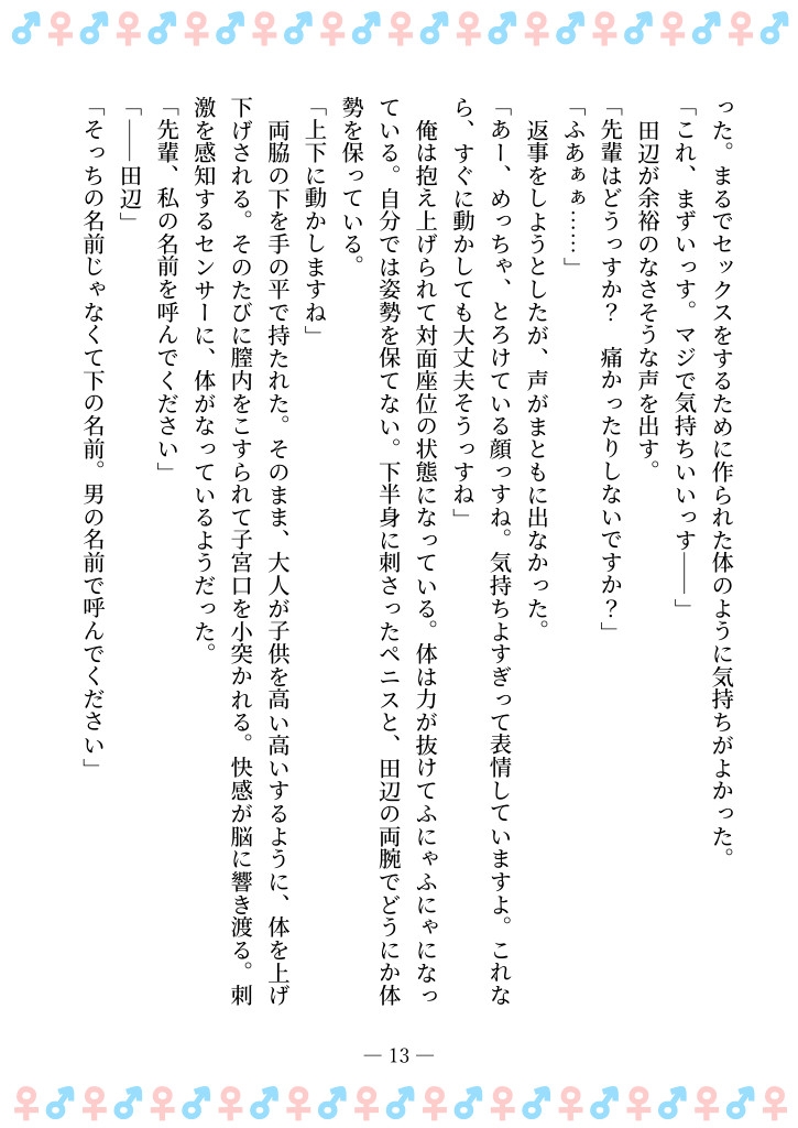 全裸、キス、フェラなど、チャレンジをこなすとポイントがもらえた。二人は、少しずつ性的な体験を重ねていく。田辺はセックスの経験が豊富で、初心な村上を蹂躙していく。そして最後のチャレンジ、受精が表示された。 ●第1章立場逆転