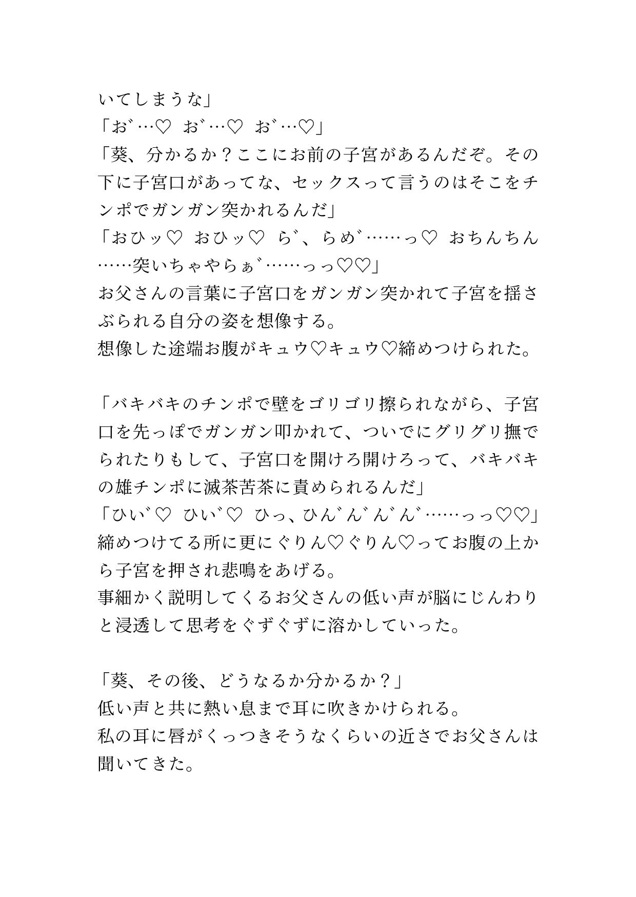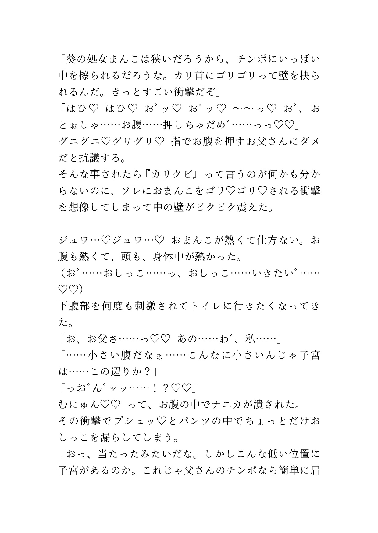 〇学に上がったばかりの娘が父親に性教育について聞かれ、答えられなくなった娘が父親の膝の上に乗せられ事細かにセックス、中出し、受精について説明を受けます。そして実際にそれを体験させられます。