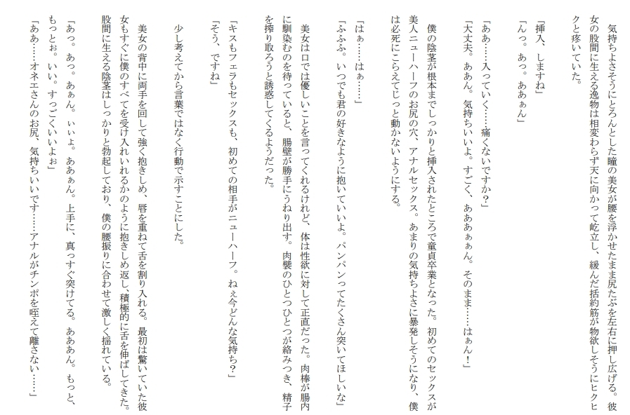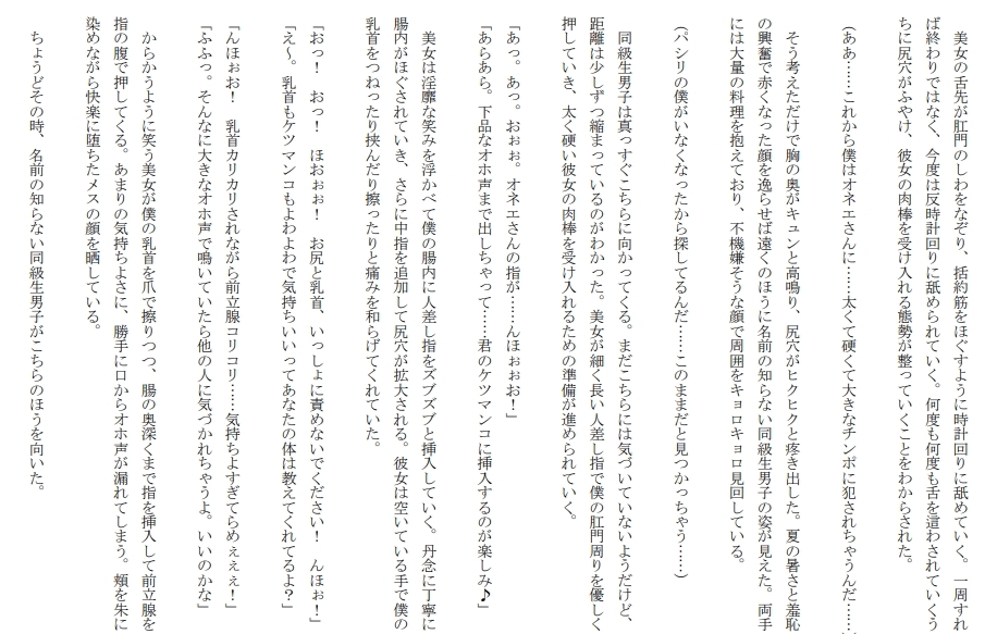 ~あらすじ~地味でまじめな男子大学生(主人公)は、夏の海水浴場でサークルの先輩たちにパシリをさせられていた。そんな時に白い水着が似合う美女と出会い、生まれて初めてナンパをする。美女とふたりきりになり、自分の想いを正直に告白する男子大学生。すると彼女は自らの股間を触らせ、ニューハーフであることを告げてきた。ふたりは夏の浜辺で唇を重ね合い、陰茎を舐め合い、尻穴に挿入し合う関係になる。