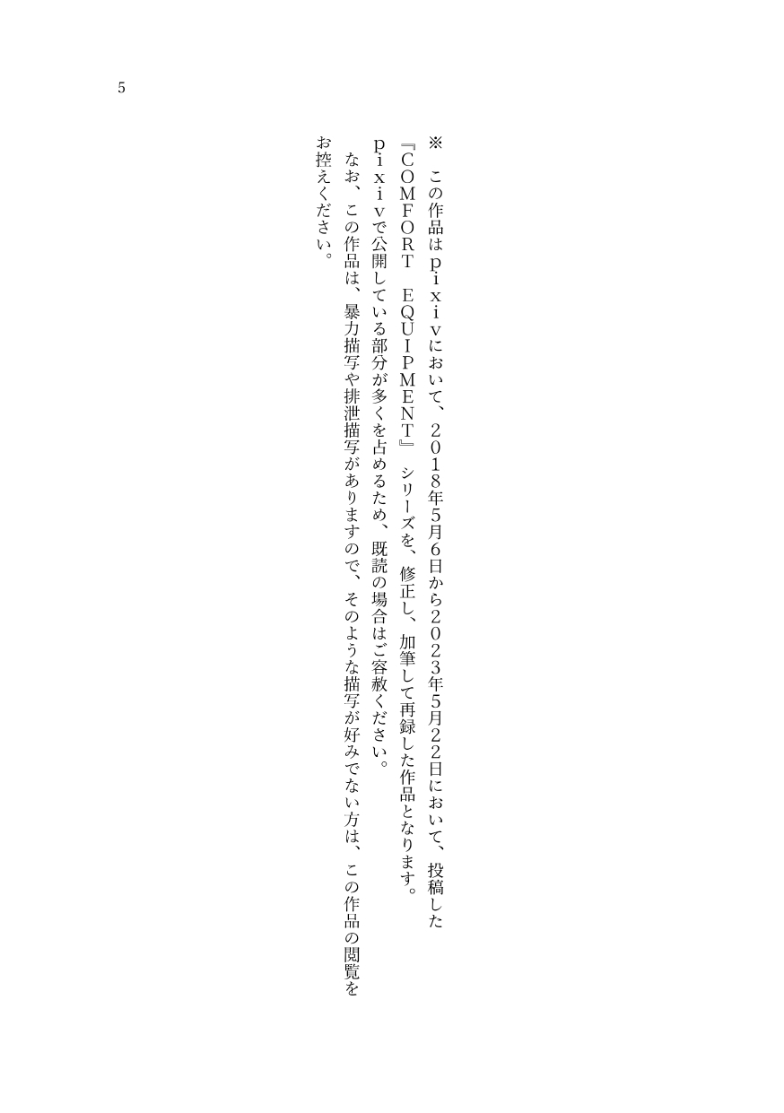 この作品はpixivにおいて、2018年5月6日から2023年5月22日において、投稿した『COMFORT EQUIPMENT』 シリーズを、修正し、加筆して再録した作品となります。pixivで公開している部分が多くを占めるため、既読の場合はご容赦ください。なお、この作品は、暴力描写や排泄描写がありますので、そのような描写が好みでない方は、この作品の閲覧をお控えください
