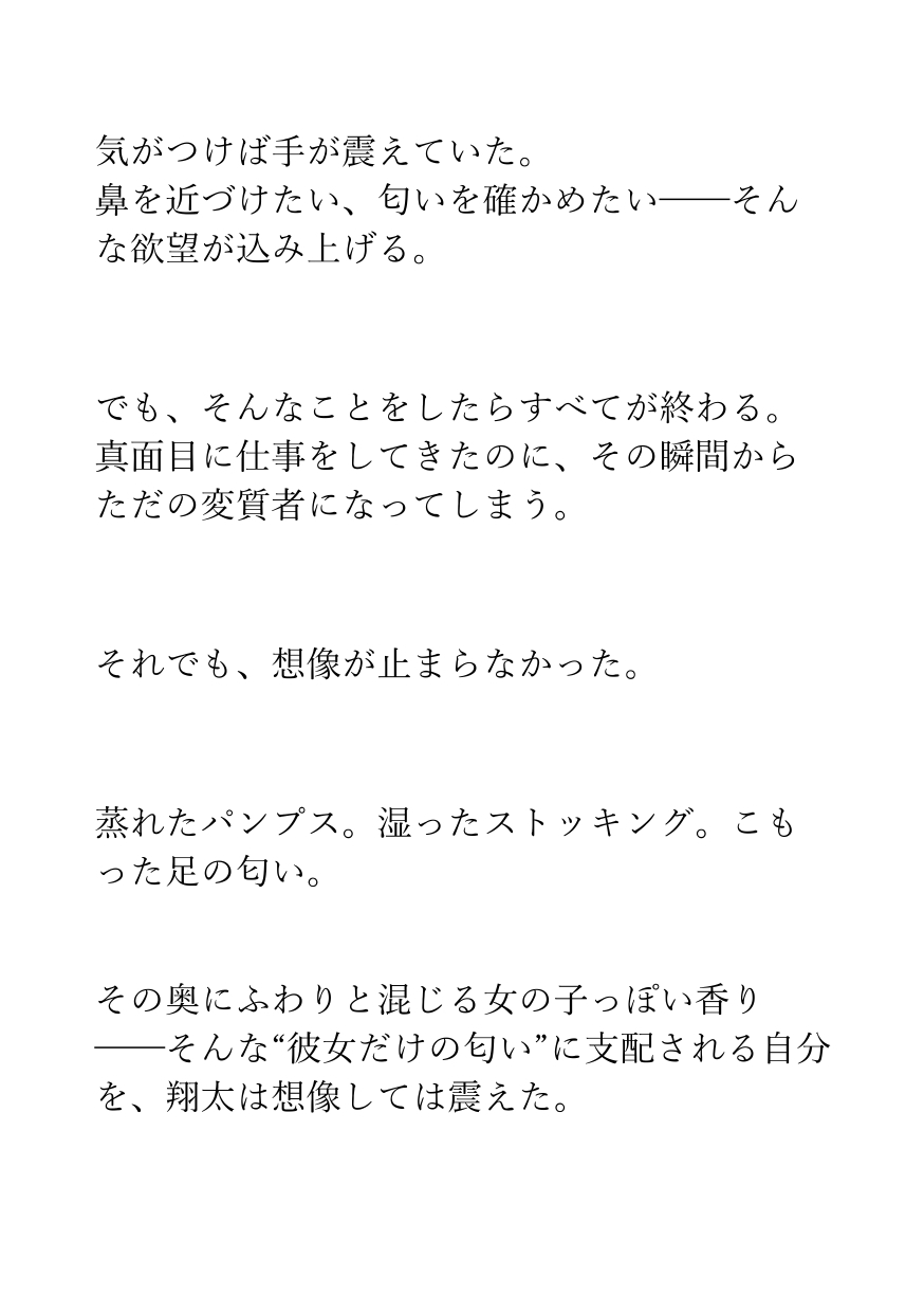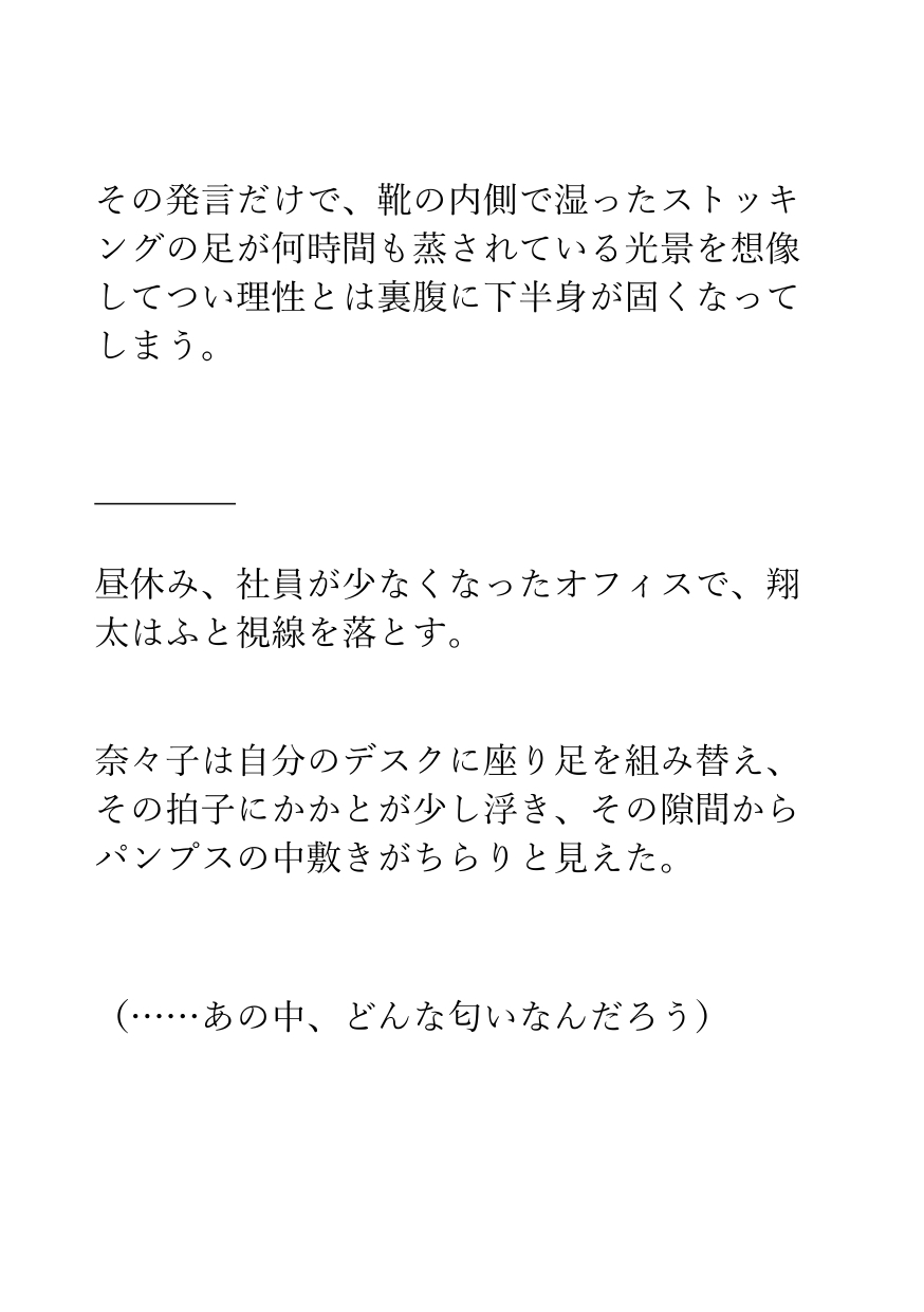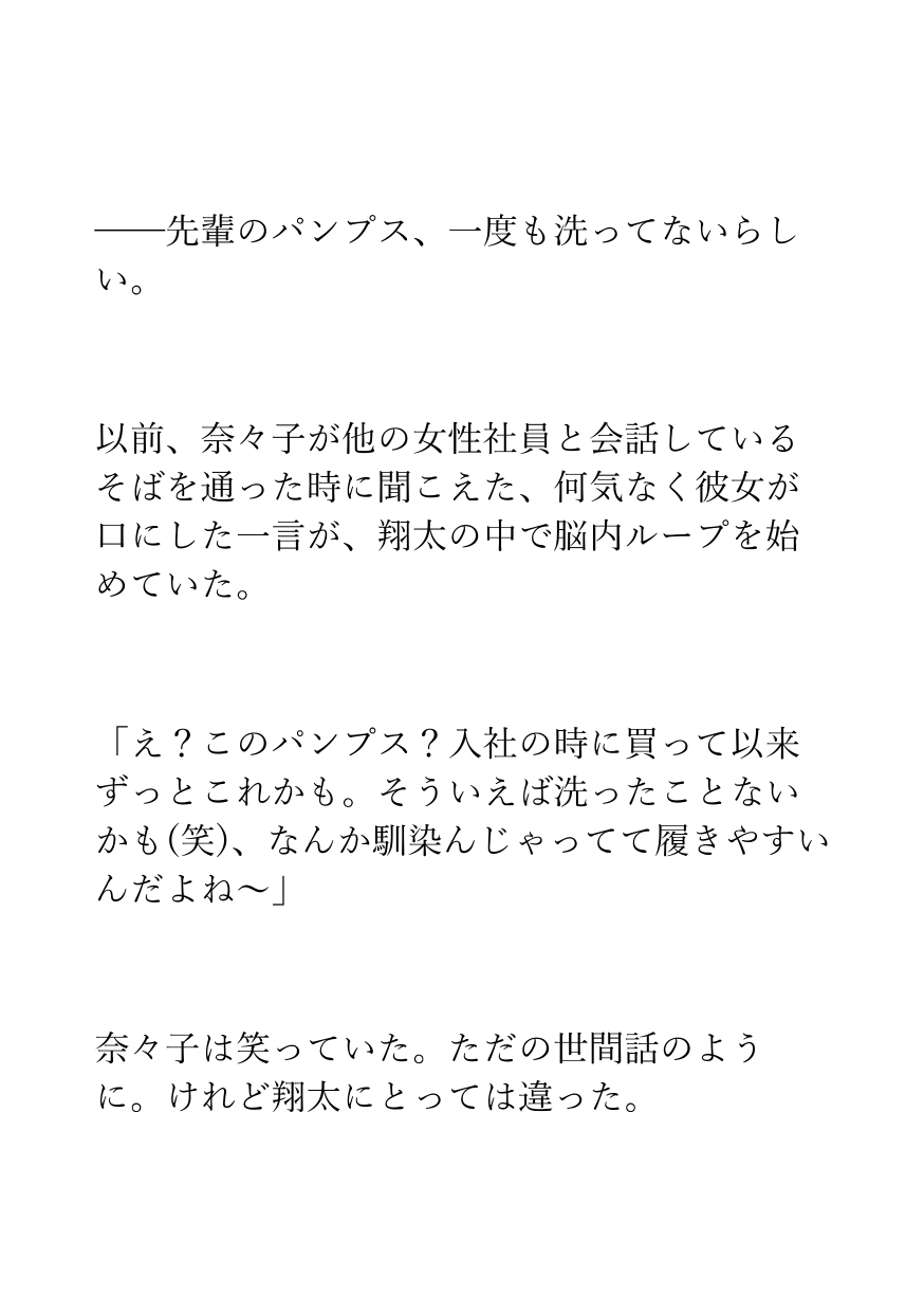 ※本作は表紙絵及び挿絵のベースにAI生成を用いておりますが、最終成果物は作者自身による修正・演出・レタッチを重ね、足元の所作や匂いの表現、音や質感の描写などフェティッシュなディテールが十分伝わるようこだわった作品となっております。 入社以来、一度も洗っていないパンプスを履き続ける可憐な先輩OL・桐谷奈々子。