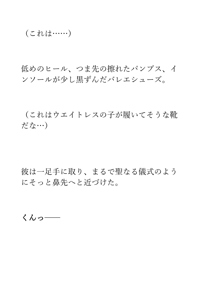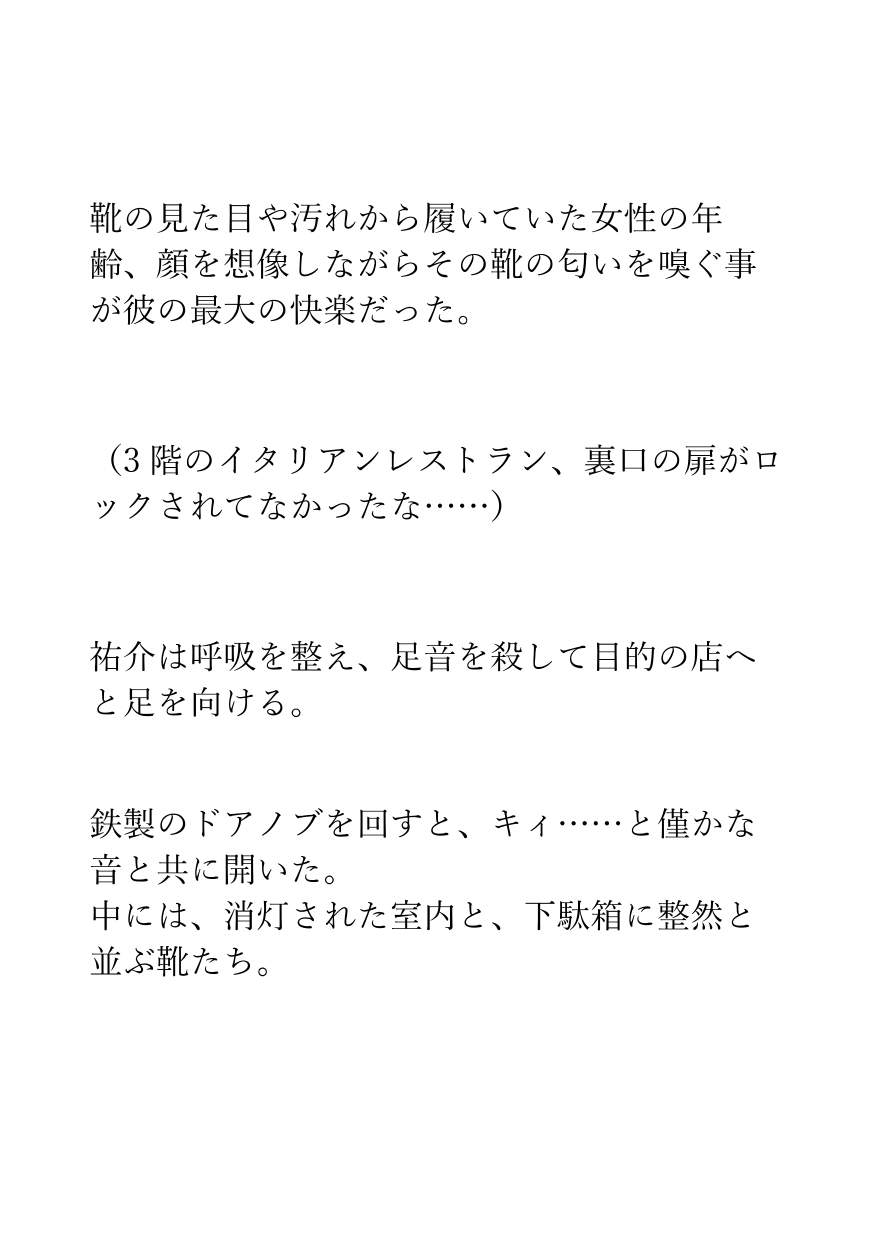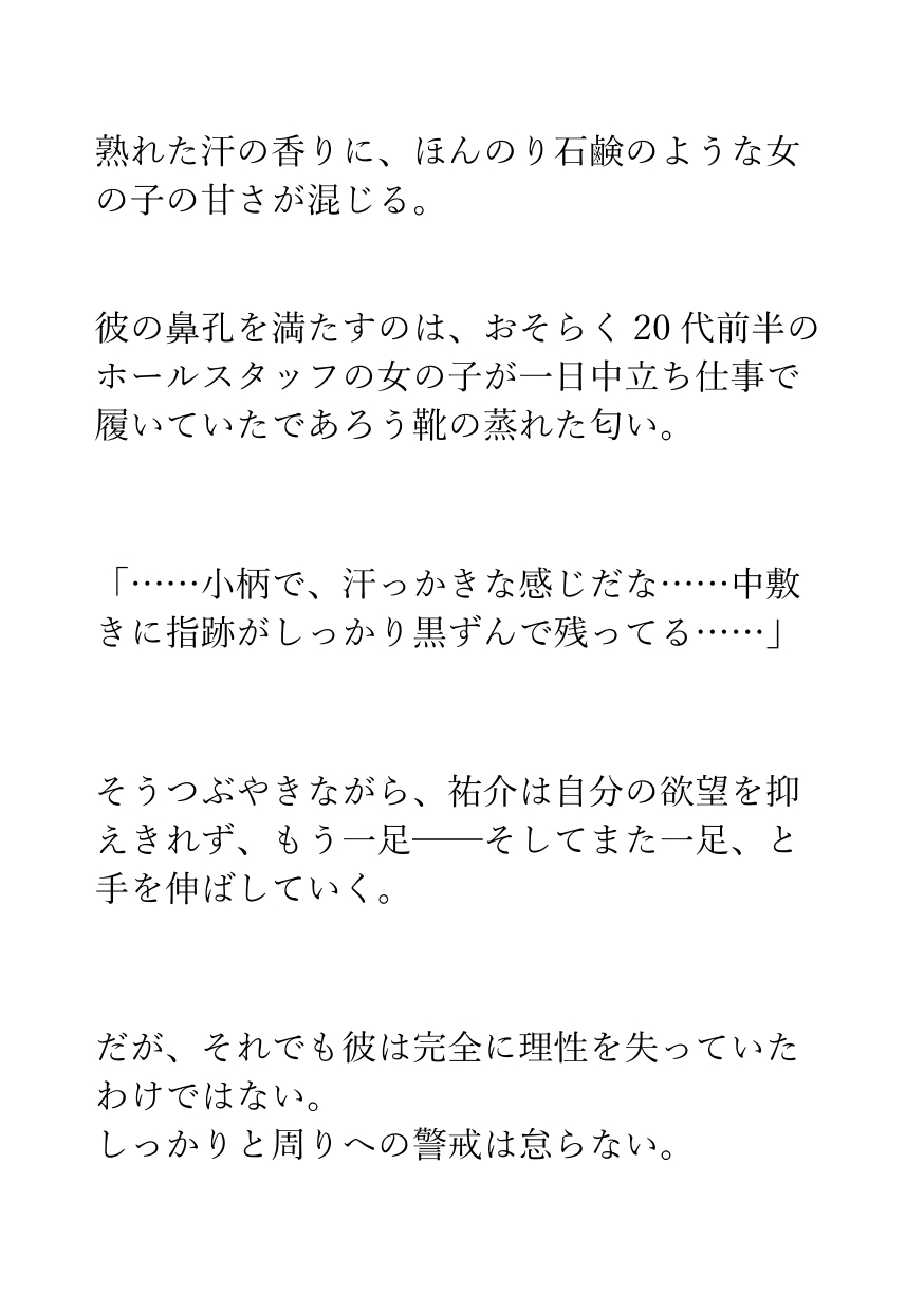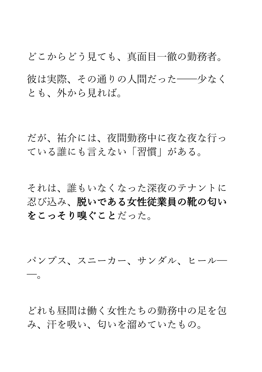 それは、深夜の巡回中にこっそりテナントに忍び込み、女性従業員たちが残していったお仕事用の靴やスリッパの匂いを密かに嗅ぎ、自身の性欲を満たすこと――。