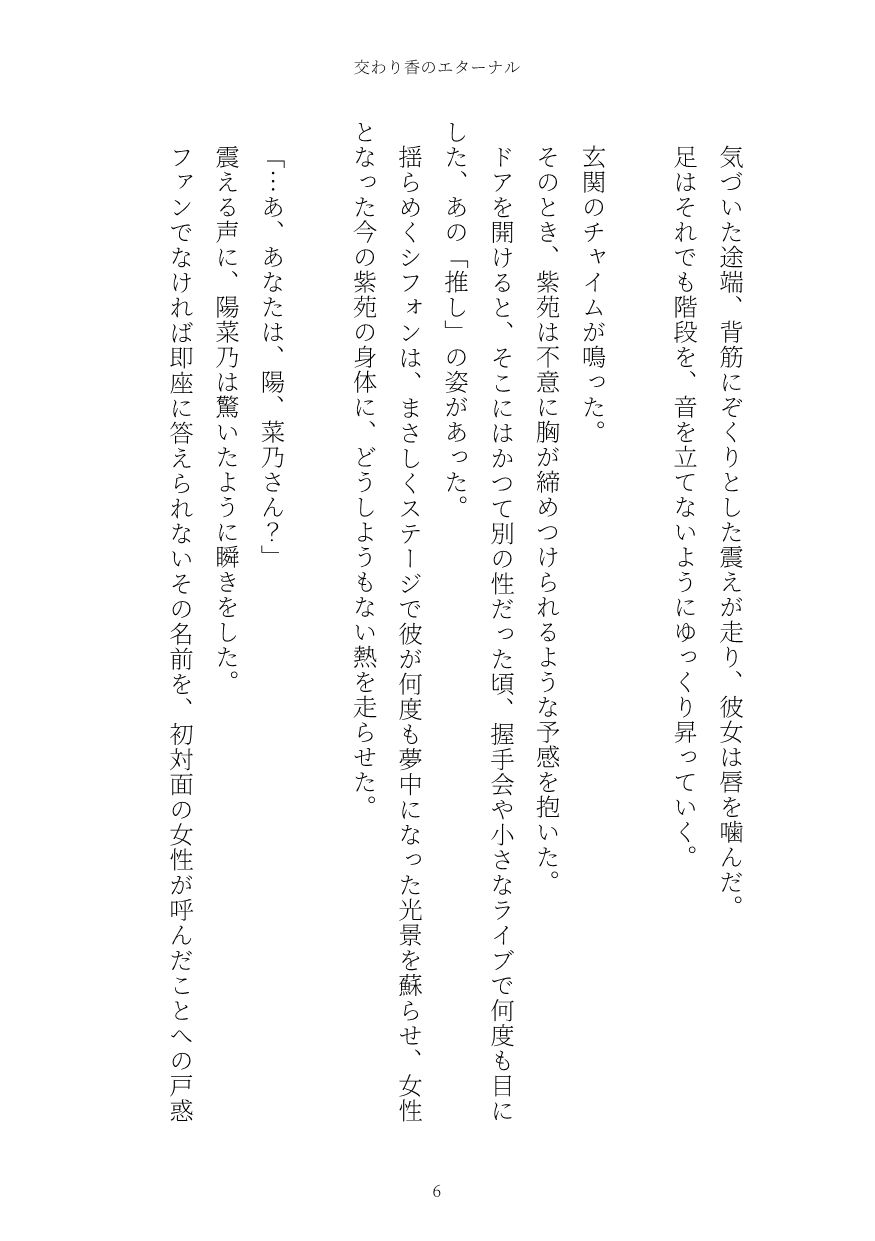 紫苑と紗奈のもとを訪れたのは、かつて紫苑が“推し”として憧れたアイドル・陽菜乃。水色と白、二つのワンピースが香りを交わらせた瞬間、三人の心と身体は溶け合い、嫉妬と欲望が渦巻いていく。推しと恋人、そして自分――誰もが香りに支配され、絡み合い、螺旋のように深まっていく背徳の関係。香りと官能が導く、濃密なる三重奏。「芳香のラビリンス」三部作・完結編。