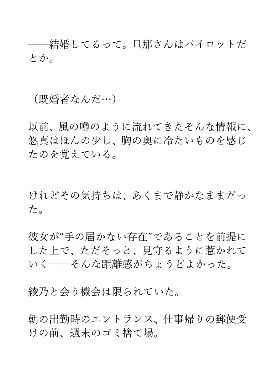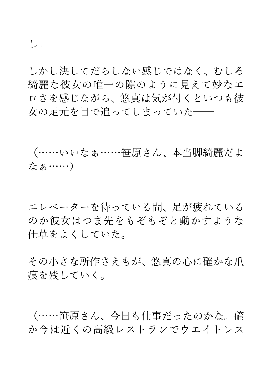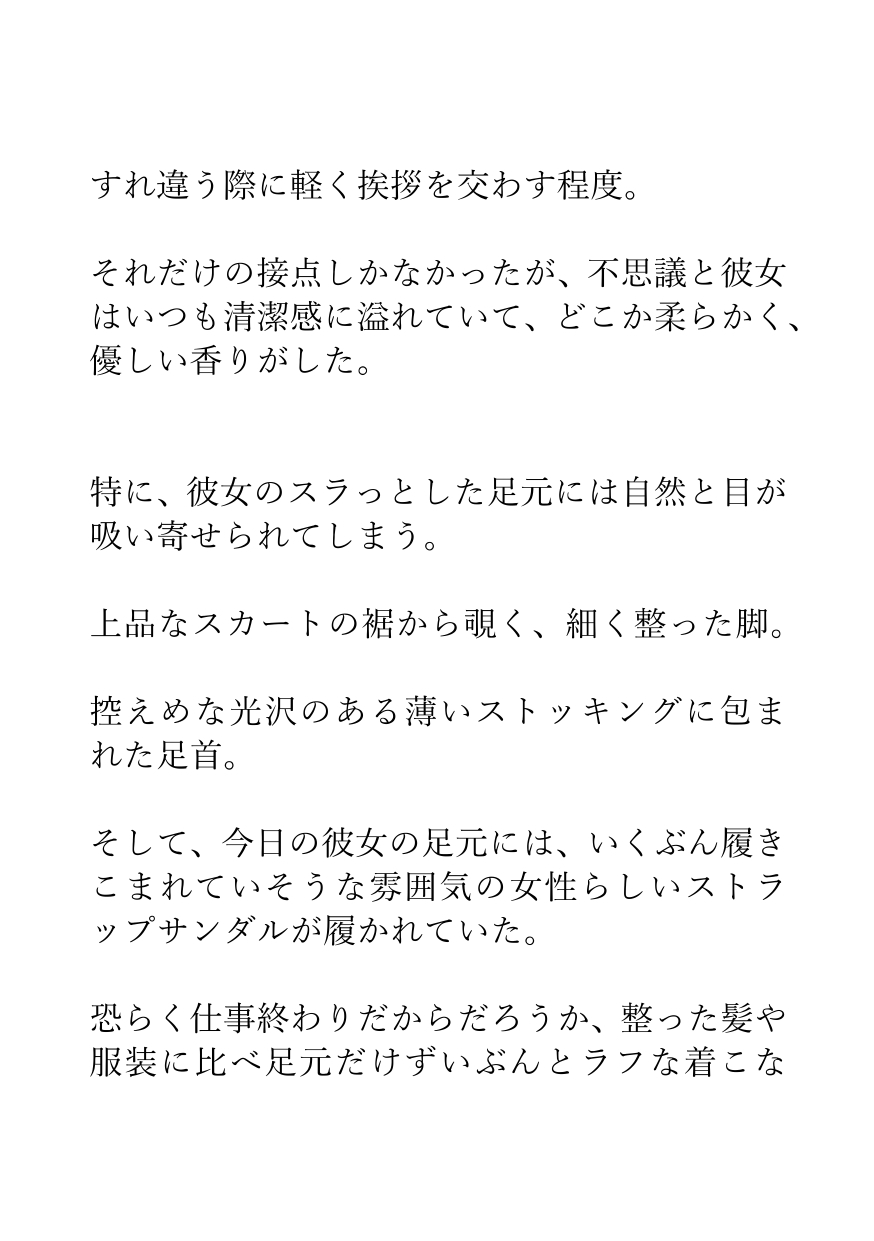 そしてある日、仕事帰りの彼女とマンションのエレベーターに偶然乗り合わせ、ふと目にした彼女のサンダルの汗染みが、悠真のすべてを変える。