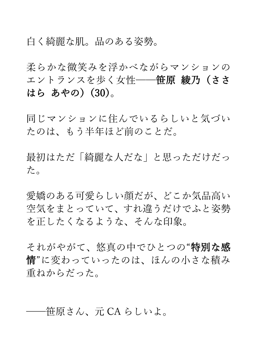 上品で清楚で、優しい笑顔の彼女は、実は元CAで現在は近所の高級レストランでウエイトレスとして働いているらしい──。