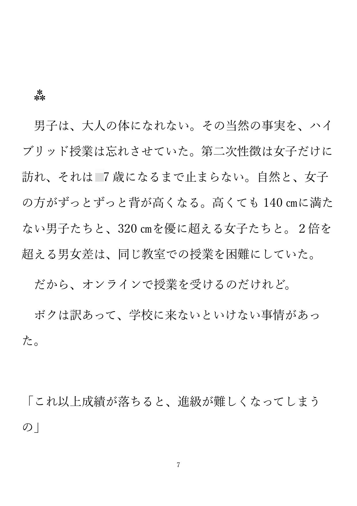 【内容】全て2.5倍差・体格差確認、チンカリ、手コキ、太もも締め落とし、母乳責め・持ち上げフェラ、飼い主化、ニーソ首輪・口移し給餌、呼吸管理キス責め、母乳責め、極悪パイズリ・お風呂集団エッチ(爆乳洗体、お尻責め、手マン、対面乳揉み、集団セックス)以上です(35000字)