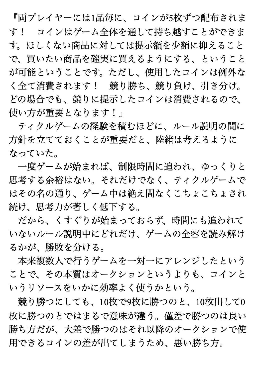 毎ターン補充されるコインを用いて、マジックハンド。回転ブラシ。くすぐり用オイル。痒み誘発パウダー。時間停止機など、様々なくすぐりマシーンや、その他の道具を落札し、先に相手を気絶に追い込んだ方が勝利となるルールのもとで、二人の女性が徹底的にくすぐり合います。