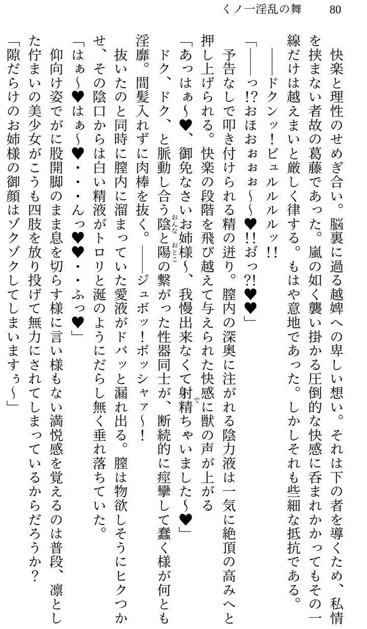 〜作品の読所〜・女の子に寄生(アナルから)するシチュが好きな方。・プロポーション抜群のお嬢様くノ一と貧乳無感情○リくノ一による濃厚百合セックス(ふたなりアリ)を好む方。・無垢で性が芽吹く前の○リなくノ一に幻術をかけて乳首やま◯こをねちっこく開発させられてしまうシチュを好む方。・操られた後輩○リくノ一にレ○プされてしまう先輩お嬢様くノ一というシチュが好きな方。以上が一つでも好きな人にはぶっ刺さる内容となっております。(※性癖が歪んでも当サークルは一切責任を負いかねません)
