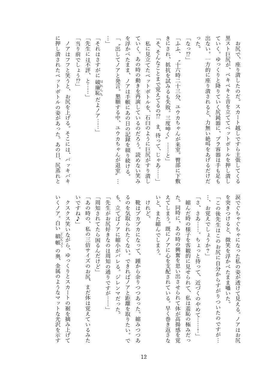 §1「ノアとたどる縮小録」……「ノアと綴る縮小譚」続編。ペットボトルや消しゴムを胸で圧し潰す様を見せつけ、縮んだらどうなるか耳元で囁くノアのお話(段階縮小)