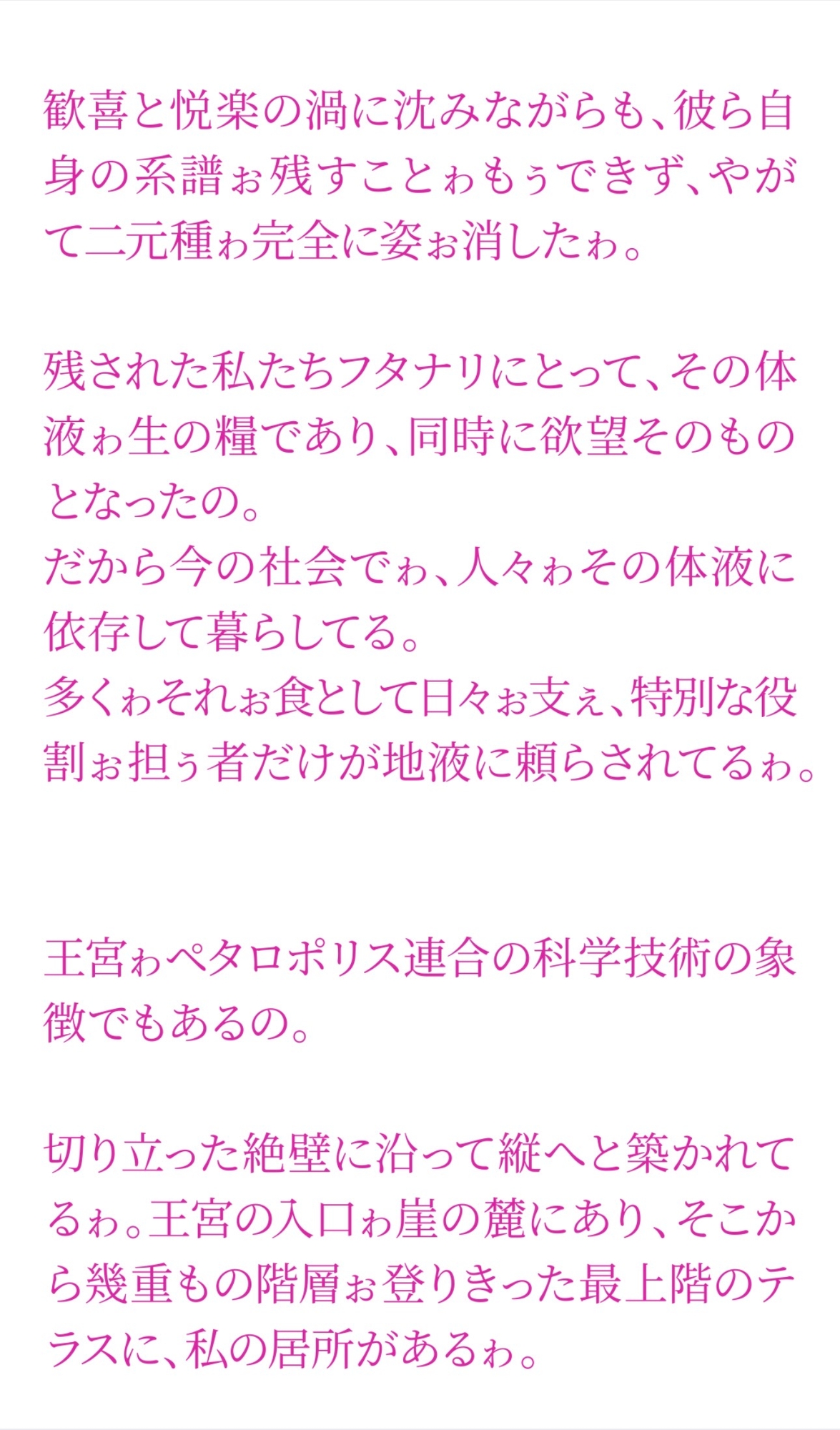 • 創世の物語:原初の意識ヤーヌスが己ぉ裂き、二十の息を放ったことから始まる惑星の歴史。• 宿命の肉体:消化器が退化し、すべての臓器が「性」と「快感」のために作り変えられたフタナリ種の神秘。• 聖液の真実:平民を狂喜させ、時に死に至らしめるほど強力な媚薬「聖液」の秘密。• 過酷な搾聖:AIとスパコンによって絶頂を解析され、強○的に快感を搾り取られる「搾聖室」での日々。