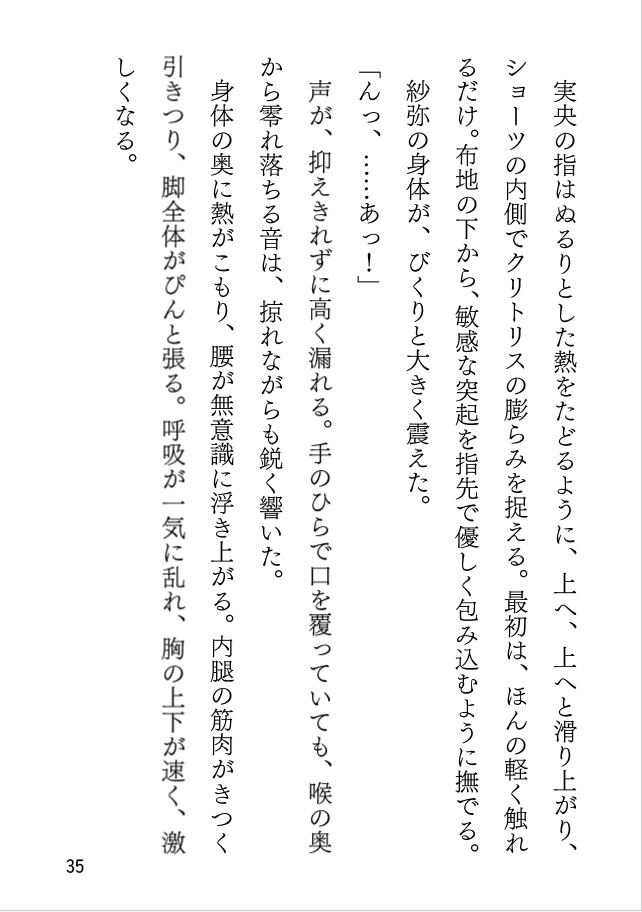 夕方の部屋で、紗弥はラグに座り、ソファにもたれてくつろいでいた。すると実央は明日の演奏の練習と称し、軽い調子で紗弥の太ももに手をやり、指でリズムを刻みはじめる。最初は冗談めいたやりとりだったが、繰り返される接触の中で、紗弥は次第に身体の違和感を意識し始めてしまう。実央の態度は変わらないまま、触れ方だけがわずかに内側へと寄り、紗弥の反応も抑えきれなくなっていく。戸惑いながらも言葉にできず耐えていた紗弥だったが、ついに静かに「……もっと、して」と口にしてしまう。その一言で、ふたりの関係は曖昧な遊びの域を越え、触れることを前提とした時間へと移っていく……