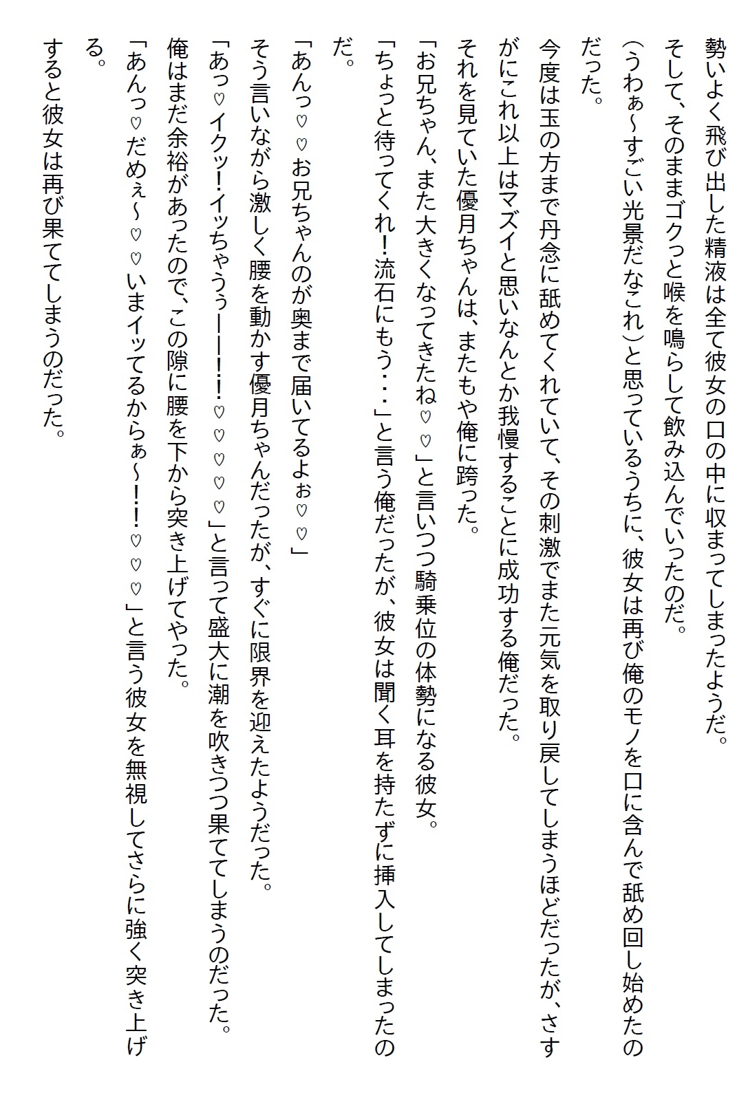 主人公・中津智章(23)は3年前から機械工として普段は工場で働いているが、機械の設計の仕事も任され、週の半分は在宅勤務することにしている。そして、工場の寮暮らしだったのを3ヶ月前から実家暮らしに戻している。それは今の家庭環境が関係しているが、ちょっと彼の環境は複雑だ。まず、実の姉である彩葉(25)がいる。彼女はバリバリの営業ウーマンである。そして義妹の優月(20)がいる。彼女は大学生である。この優月は3年前にお互いの親が再婚してできた義妹である。その両親は、子供を日本においてイギリスに移住してしまったのだった。なので、智章が実家に帰ることによって、今は智章、彩葉、優月の3人で実家で暮らすことにしたのだ。普段は3人仲良く暮らしているのだが、なぜか智章と優月が2人になると微妙な空気になってしまう。彩葉はその理由を知っていたが、智章には内緒にしており、智章も気づくことはなかった。そして、とある夜にその時はやって来る。彩葉から智章に電話がかかってきて、「今日は帰れない」と言う。それからなぜか「気をつけてね」と言ってくるのだ。智章はなんのことかを問いただすが、彩葉は答えない。最後には「しっかり食べられなさい」と言って彩葉は電話を切った。首をかしげる智章だったが、その背後に優月が迫っていることを知る由もなかった。その後、押し倒された智章は優月に美味しくいただかれ、いや、搾り取られてしまう・・・