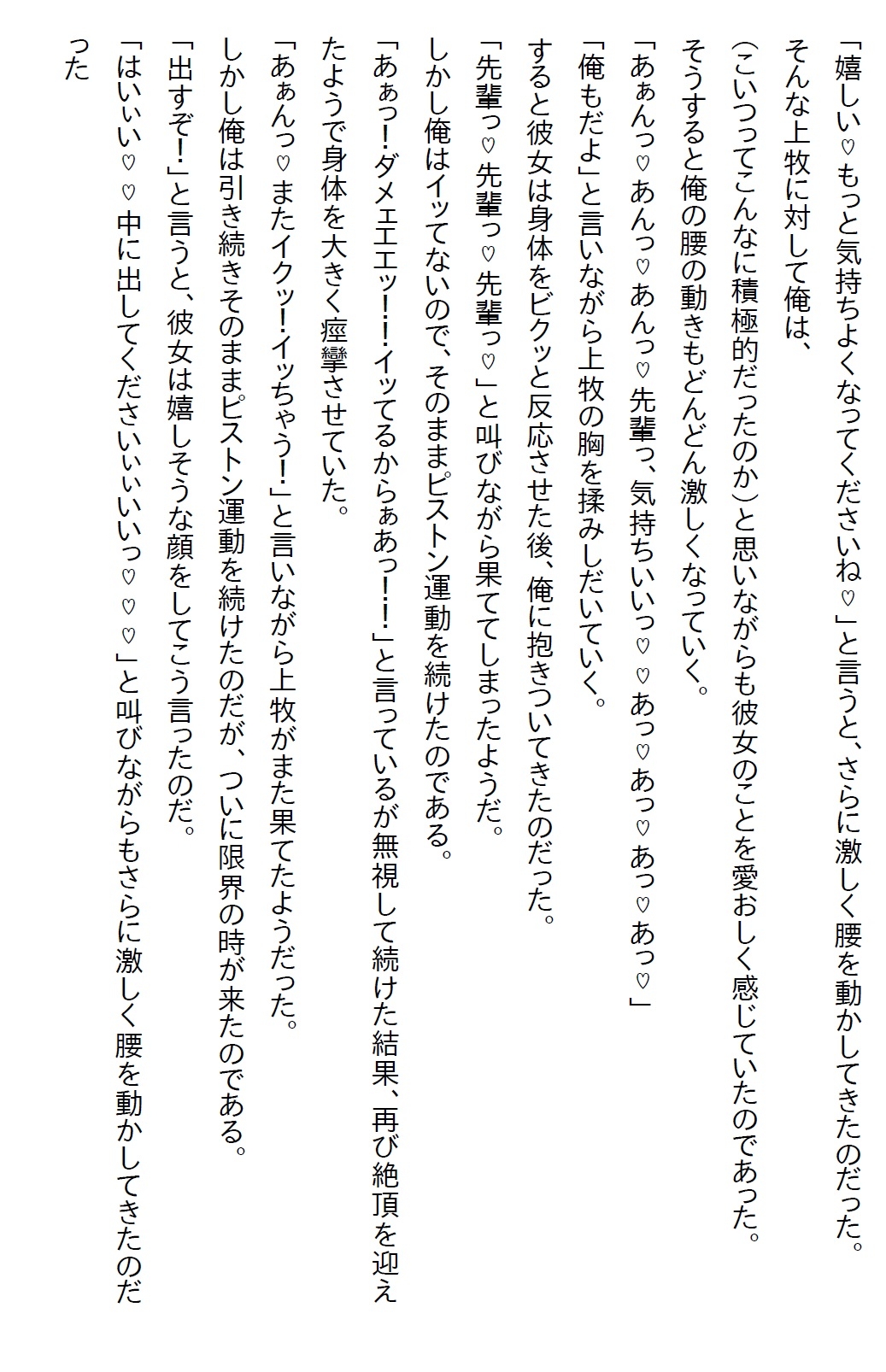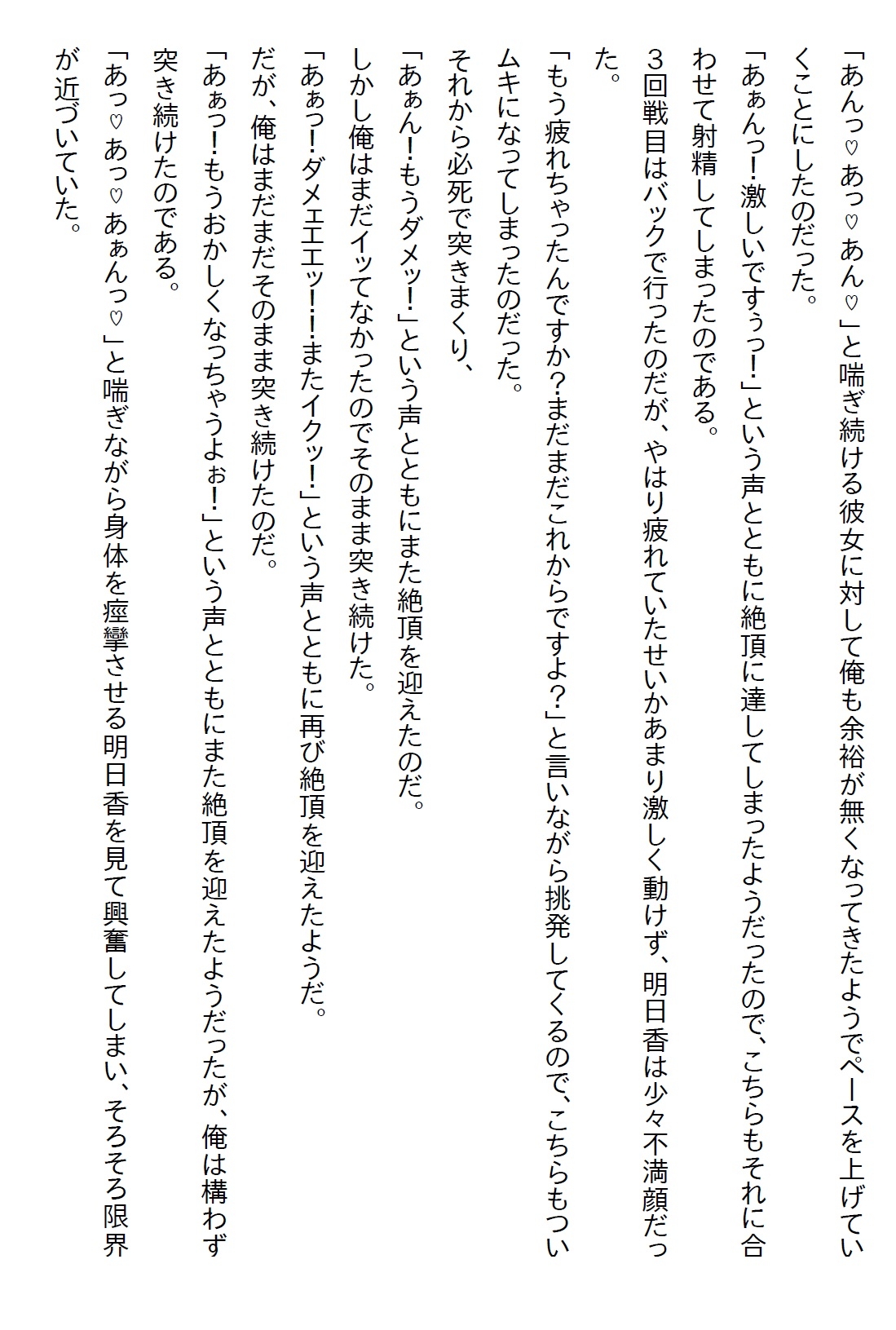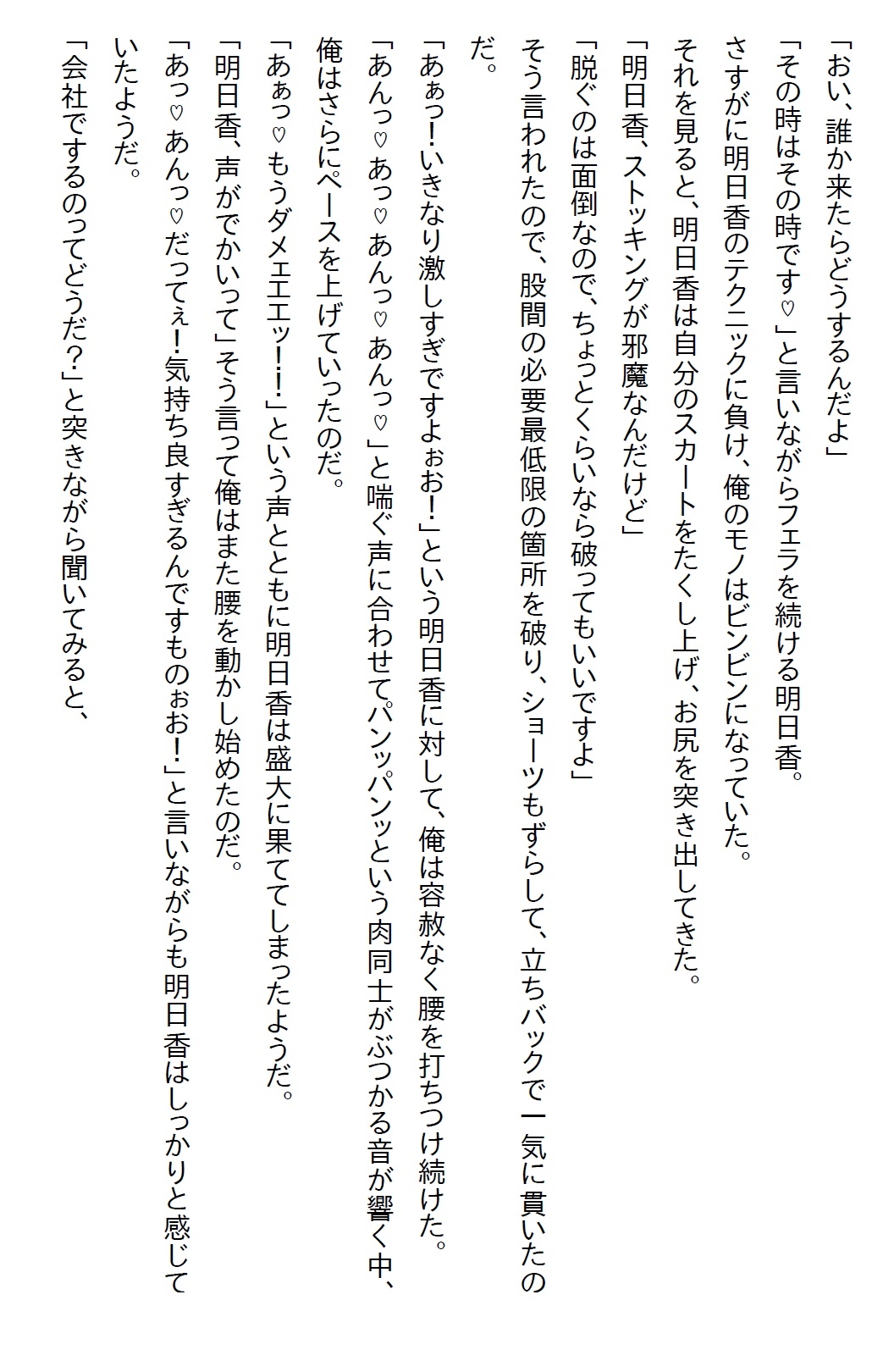 主人公・水無瀬悠希は広告代理店勤務のサラリーマンである。現在、前部署の元上司からの相談を受けている。その相談とは、悠希が前部署にいた時に教育係をしていた上牧明日香についてだった。詳細は百聞は一見に如かずということで、さっそく元上司と一緒に明日香の様子について観察していた。すると、話をしにきた社員に対してかなりの塩対応だったのだ。元上司は、社内だけなら百歩譲って許せるが、これから社外対応が増えてくるので、このままでは困ると言う。そこで、唯一明日香が懐いていた悠希に上司は託したというわけだった。高級ウイスキーを飲める権利と引き換えに、悠希はこの問題に乗り出した。上手く話をするために、悠希はその週の金曜日に二人で飲みに誘う。明日香はかなり乗り気だったので、まずは第一関門突破であった。そして、その金曜日、同僚に教えてもらったお店で二人は飲んで、食べて、しゃべってと、充実した時間を過ごす。最後に、本題であった明日香のコミュニケーションについて話をする。明日香はそのことについての認識があり、改善しようと考えているようだった。そこまで話せればミッションクリアだ。そして二人で店を出ると、明日香が2軒目を誘ってきた。悠希がどこへ行くか思案していると、「私の部屋に行きましょう」と言ってきた。飲んだ後に家に行く。つまりはそういうことだった。緊張した雰囲気が二人を包む。明日香の家に着いた二人は一線を越えるのだった・・・翌朝、悠希が起きると明日香すでに起きていた。明日香が念のためにワンナイトではないことを確認すると、「責任は取るつもりでいる」と言われ安心する。そうやって二人は付き合うことになったのだが、明日香の性欲スイッチが入ってしまい、時間を問わずにエッチをすることに。ここでわかったのは、明日香は塩対応からは想像できない肉食系だったのである・・・