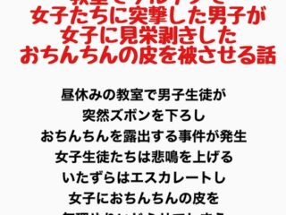 教室でフルチンで女子たちに突撃した男子が、女子に見栄剥きしたおちんちんの皮を被せてもらう話
