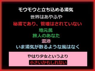 管理されてない地元の温泉にあなたが浸かっていると、湯気の向こうで地元の少女が入って来た。少女はまだあなたの存在に気が付いていない……5ページ